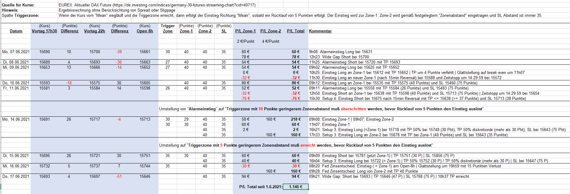 Ergebnis des GeorgM Regelwerks bei strikter Befolgung mit geringstmöglichem diskretionären Anteil seit 1.6.2021: 1146 EUR (mit 2 und 4 CFDs, ohne Berücksichtigung von Spread oder Slippage)