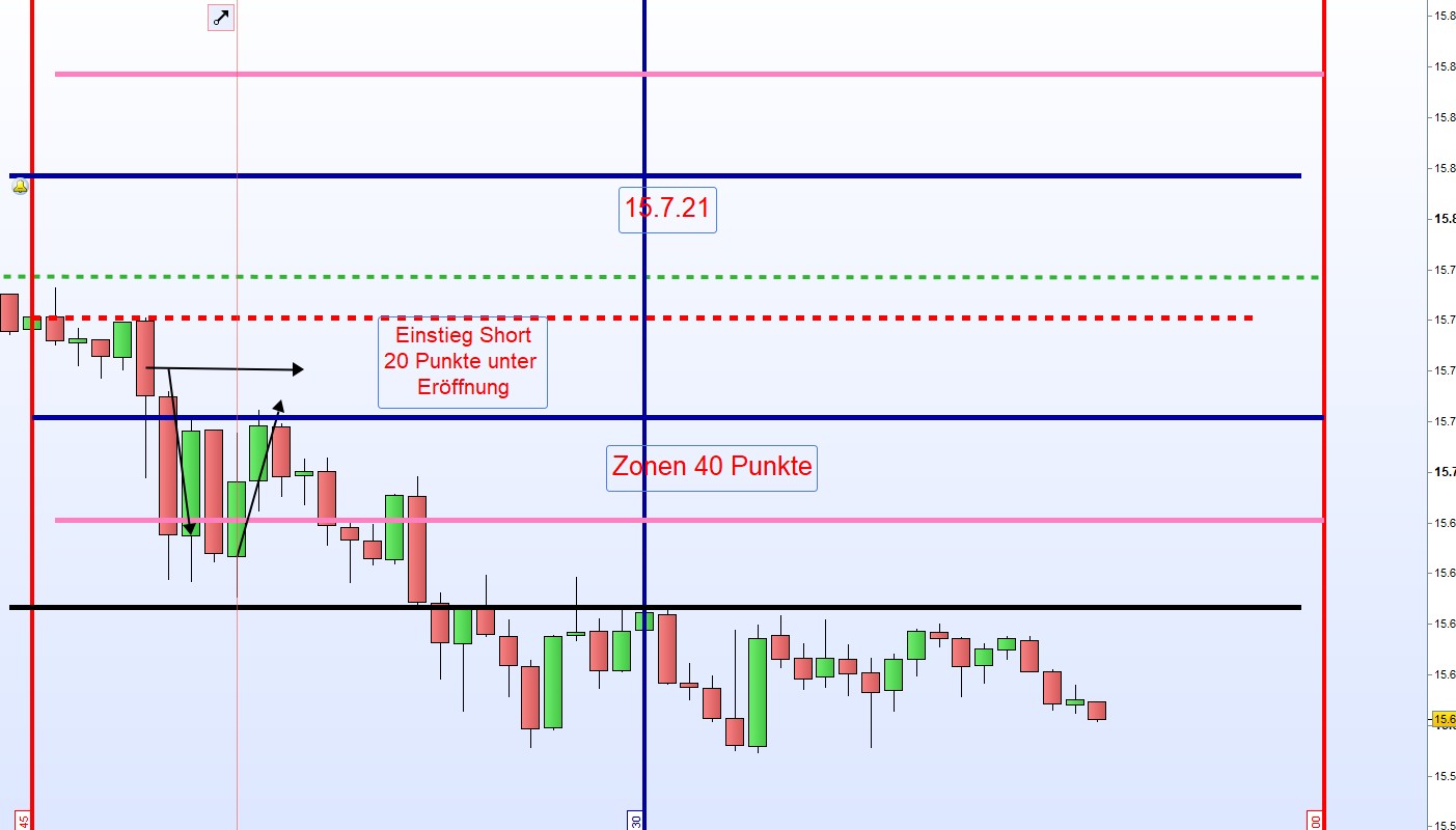 Aus dem Chart von heute ist ersichtlich, dass der Kurs um 8:45h über der 20 Punkte Marke notierte und die Shortposition erst mit der 9:00h Kerze eröffnet wurden. Natürlich kann der Kurs vorher diese Marke unterschritten haben.