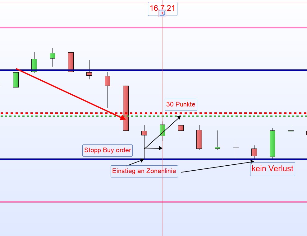 Siehe Chart. Wäre durch Berührung der Zonenlinie und direkter Umkehr der Einstieg mit der Stopp Buy Order erfolgt, dann wurde das Mindestziel von 30 Punkten nicht erreicht. Erfolgte der Einstieg an der punktgenauen Zonenlinie dann hat diese Position nie im Minus notiert. -