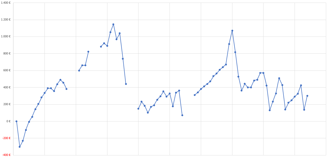 Dazu gehört allerdings in erster Linie Durchhaltevermögen. Wer sich intensiv mit der Strategie beschäftigt wird in einem Jahr geschätzt 80% des Potenzial erwirtschaften können. Mit Positionserhöhungen durch erreichten Gewinn eine Goldgrube. Richtig!