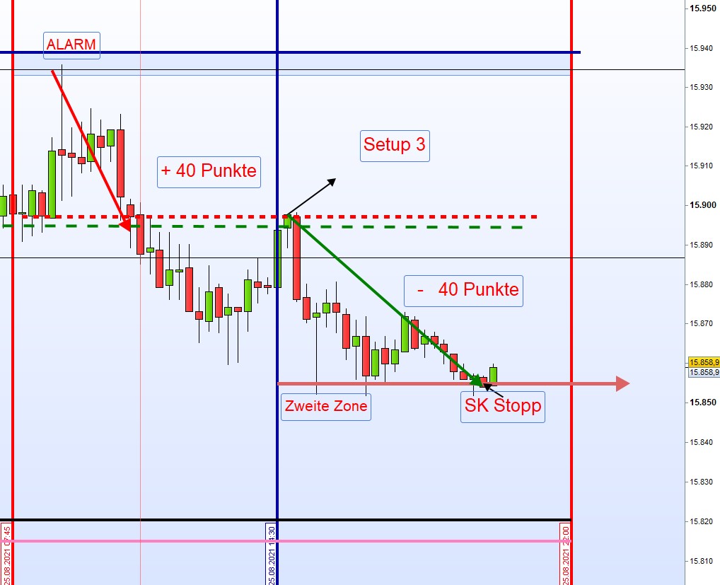 Weiterhin ist aufgrund der erhöhten Notierungen von DAX und DOW zu beobachten, dass bei einer Notierung dieser Indizes von minus 0,5% + morgens um 8;00h mit stark fallenden Kursen zu rechnen ist. Liegt diese Notierung vor dann erfolgt ein Einstieg Long erst an der zweiten Zone bzw. darunter. Falls Unsicherheit besteht, wird auf den Handel verzichtet.