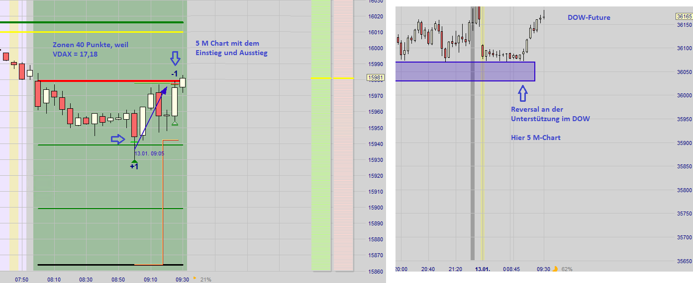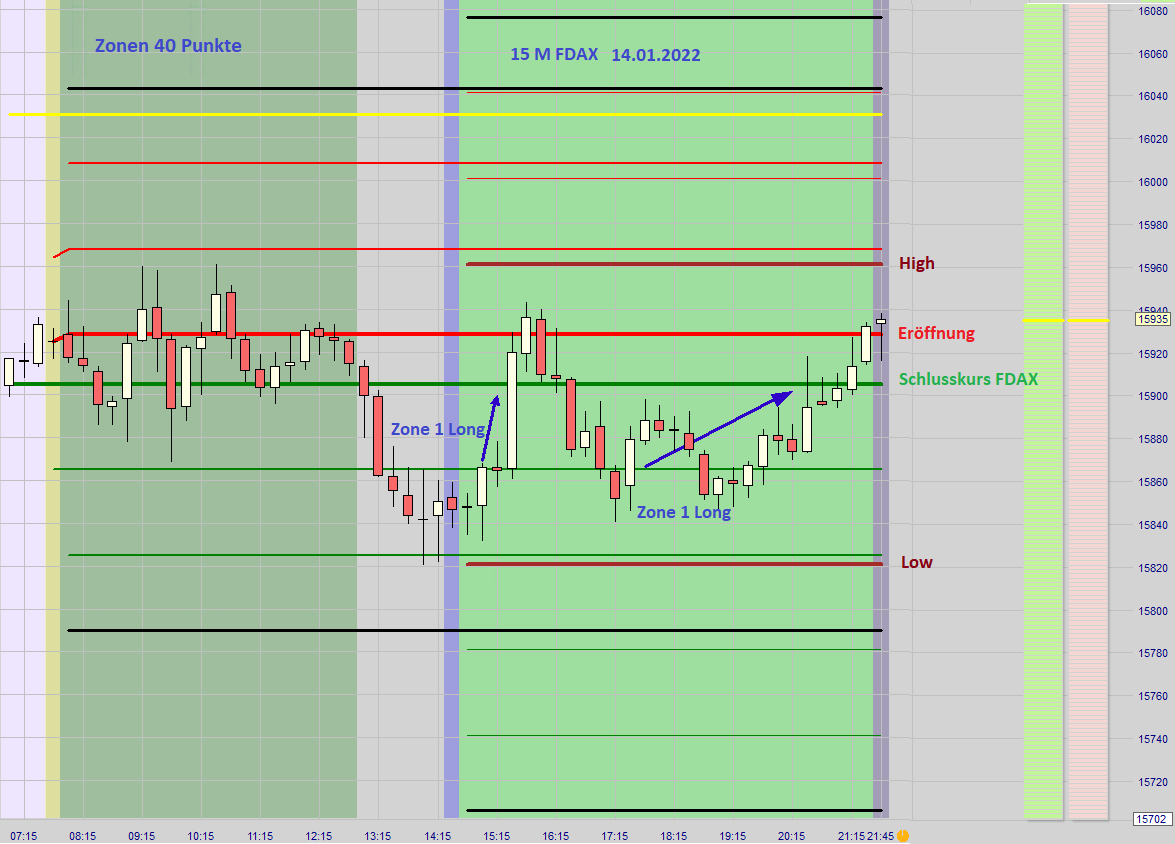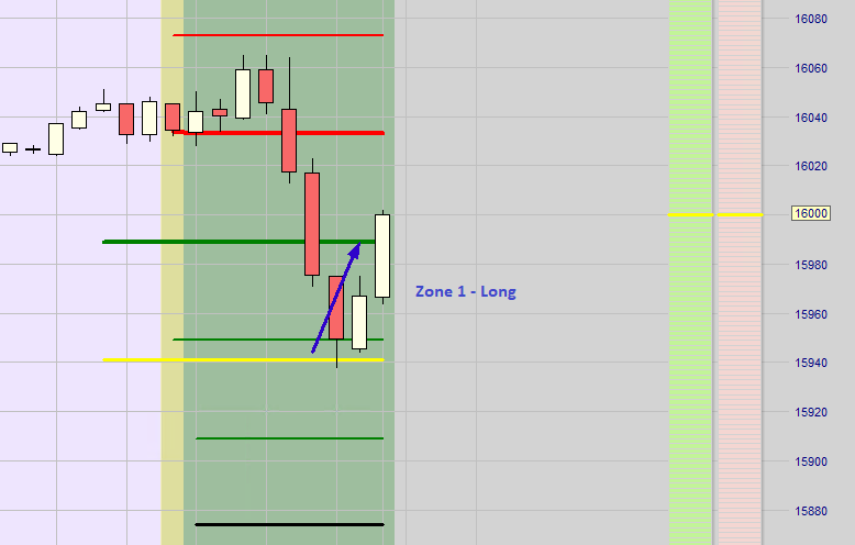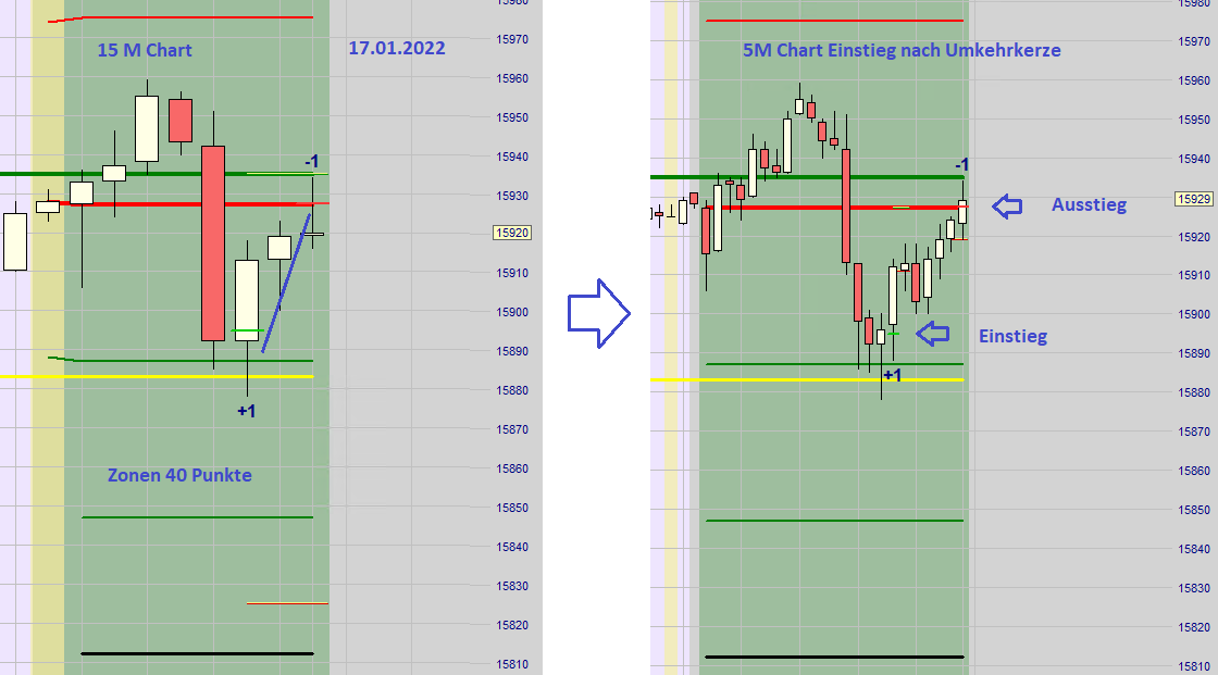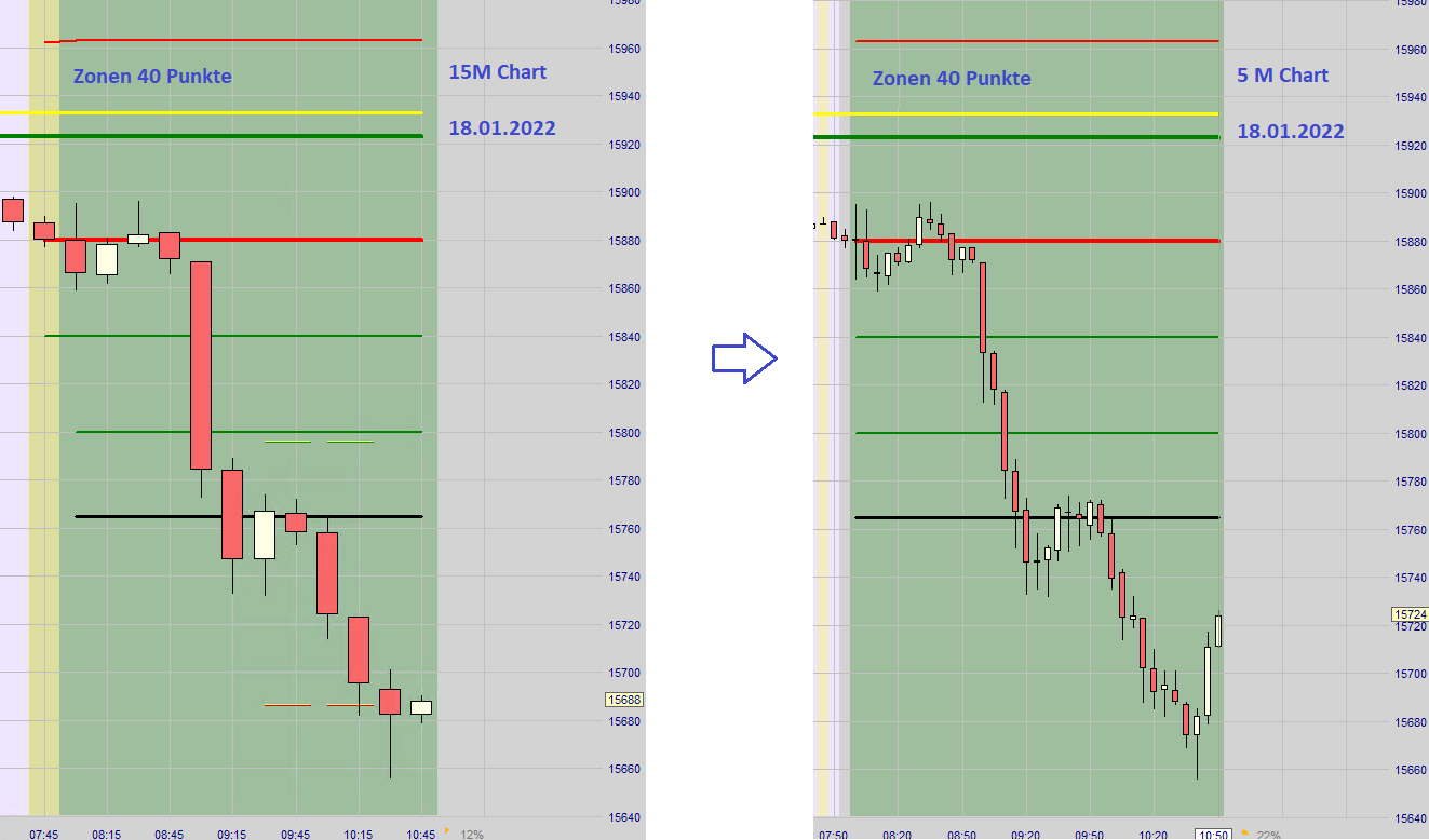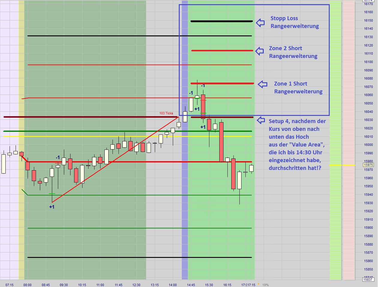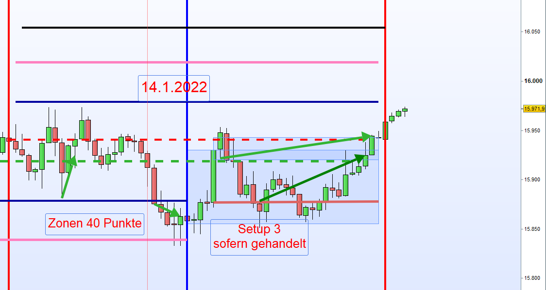 Nachdem ein Ersteinstieg (Long oder Short) ausgeführt wurde und an der dann folgenden zweiten Zone erkennbar ist, dass der Kurs mit hohem Momentum in den Stopp Loss gehandelt wird oder allgemein eine Unsicherheit besteht wird auf eine neue Positionseröffnung verzichtet und nur die Position aus der ersten Zone bleibt offen. Gemäß dem Höchstverlust der sich durch die Positionen aus der ersten und zweiten Zone ergäbe wird ein neuer Stopp Loss nur für die Position aus der ersten Zone gesetzt. Die Wahrscheinlichkeit einer Verlustkürzung oder sogar Gewinnerzielung ist sehr hoch.