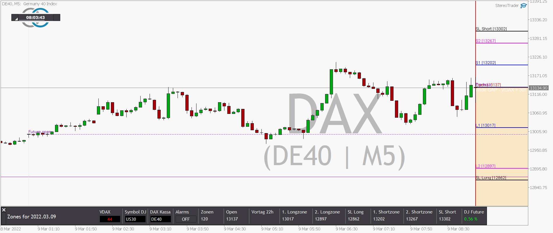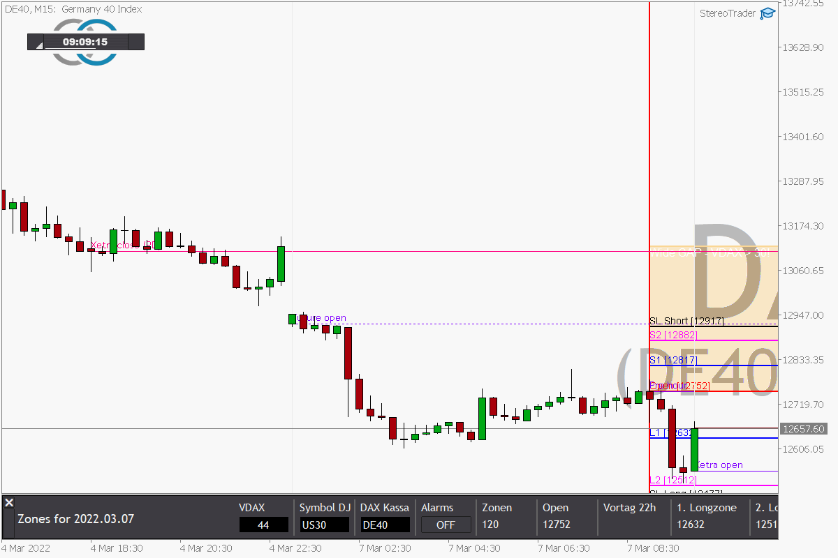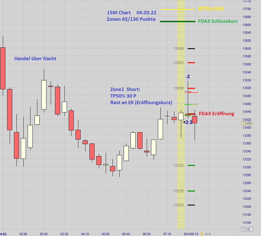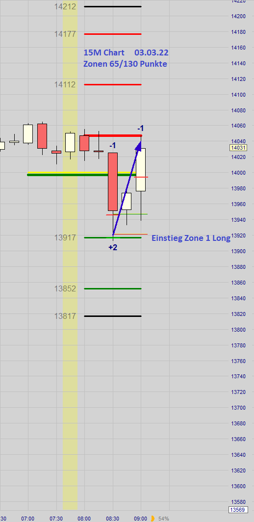 Der Chart von heute, den 03.03.22 (Mini-DAX). Erster Trade an Zone 1 Long, es ist schon erstaunlich, wie gut das funktioniert.