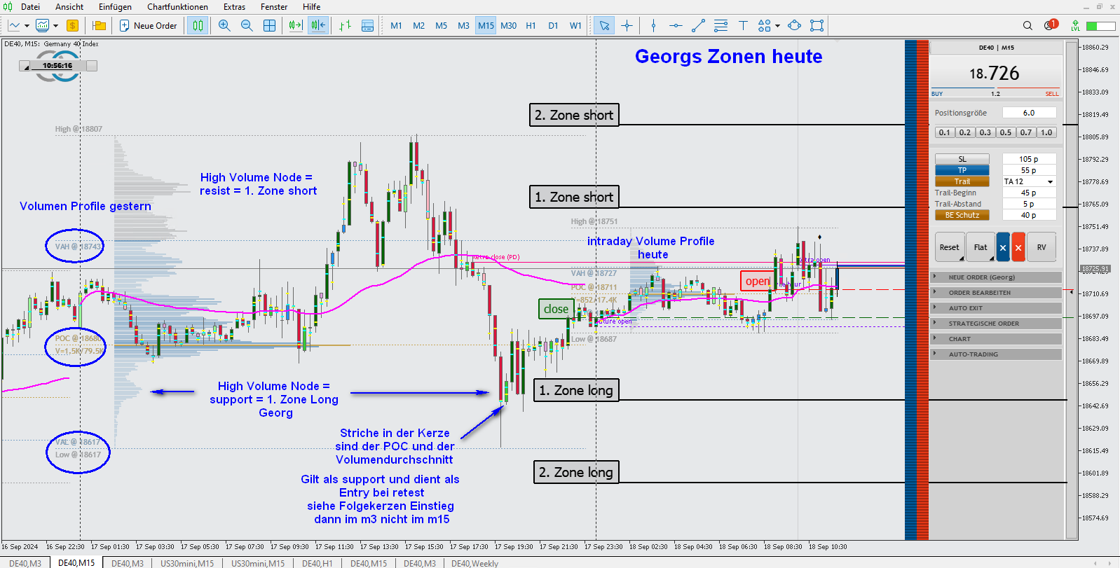 Wenn ich richtig informiert bin fußt der Trading Ansatz von Olli auf dem Market Profile. Es gibt kein exaktes Regelwerk mit Ein- und Ausstiegen, ist mit dem Profile auch nicht möglich, und keine Unterteilung Trading am Morgen oder Nachmittag.