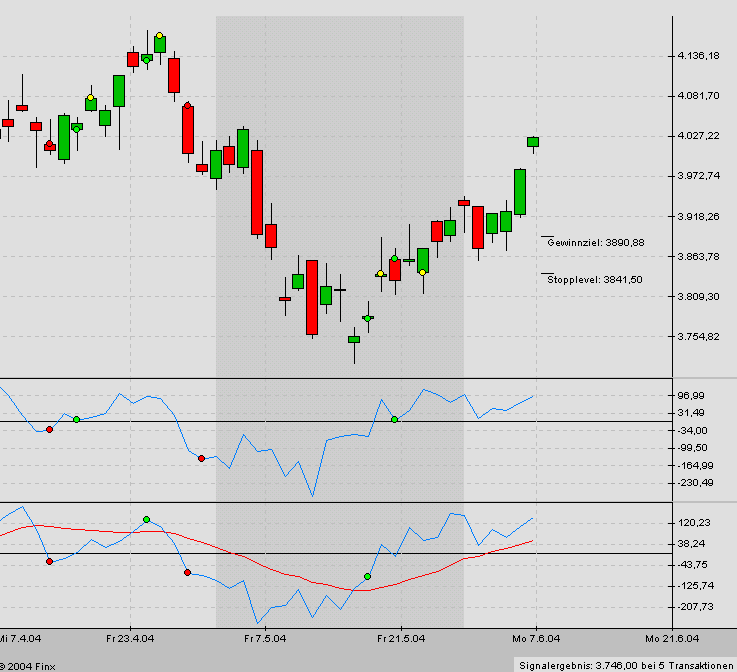 Am Dienstag zur Eröffnung ergibt sich ein Short-Signal. Sofern der Einstieg bei 3933,50 erfolgt (mein Limit bei schwächerer Vorbörse), sind Trailing-Stopp und Gewinnziel per Schlusskurs im Chart angegeben.