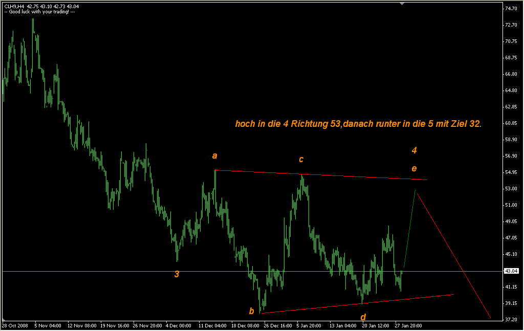 Naja, auch wenn wir Techniker sind sollten wir mal überlegen warum das Öl fallen könnte, bzw. welchje fundamentalen Gründe hinter dieser Technik stehen und warum es in meinen Augen nicht das tun wird was Du erwartest (vielleicht wird es kurzfristig um 10 USD fallen als Korrektur, aber das wars):