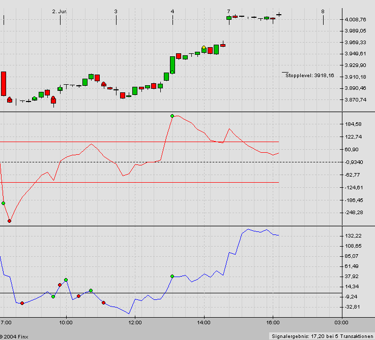 Momentum + CCI sind im Stundenchart nach dem Kursrutsch Short. Als Einstiegspunkt werden 3964 vom Signalsystem vorgegeben. An diesem Punkt (Momentum-Signal) ist Long zu schliessen und eine Short-Position zu eröffnen (aktuell nur per Limit möglich).