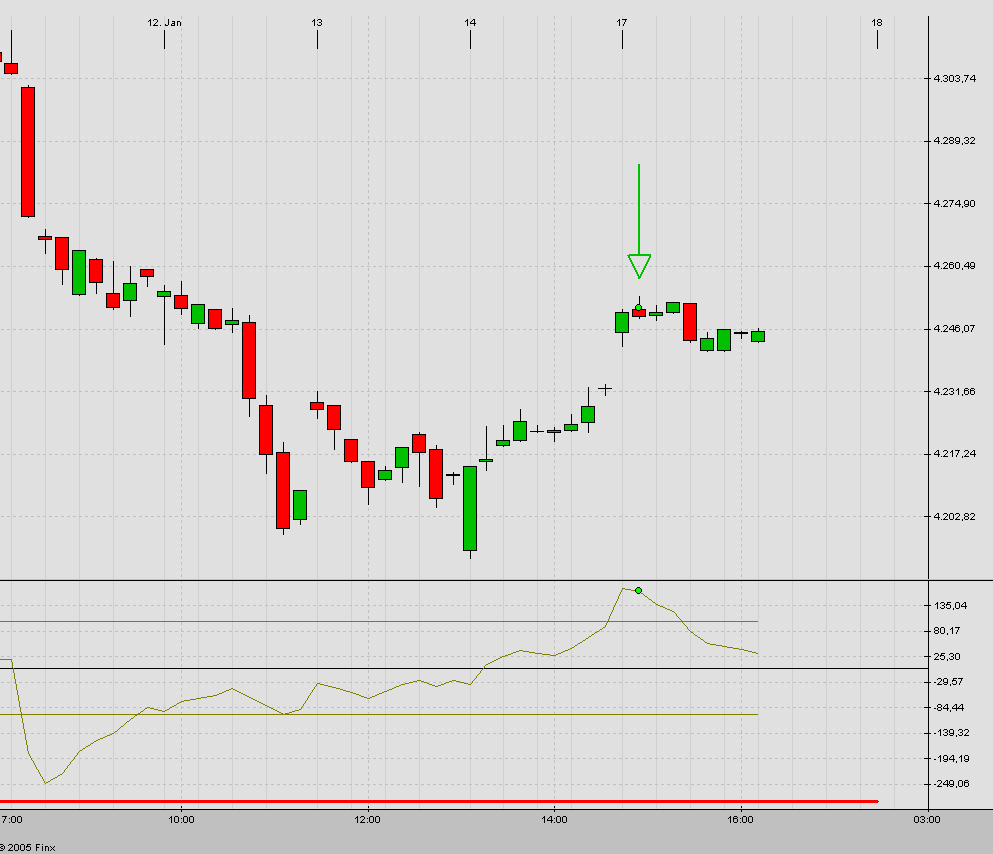 es gab am Montag mit der 10:00 Uhr Kerze bei 4250 das Long-Signal, was ich einfach ignoriert habe. Das Problem ist erst am 04.02.2005 entstanden; die Strafe für Inkonsequenz.