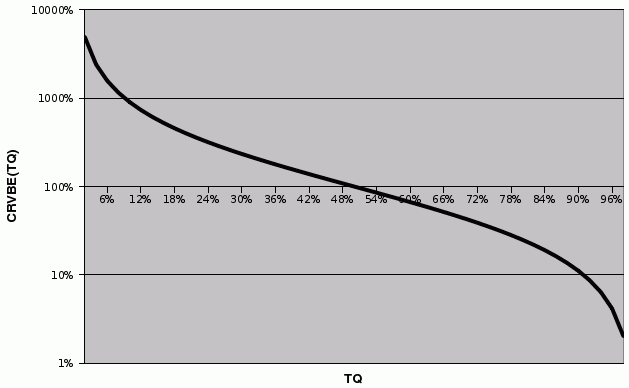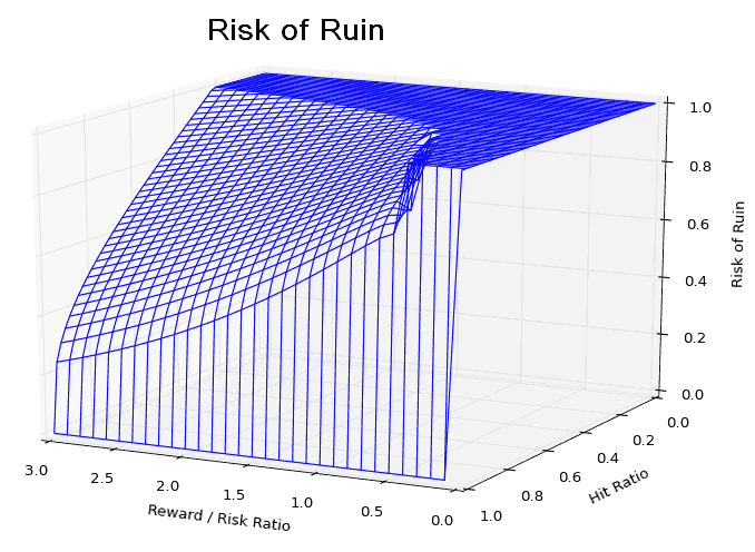 Ausgehend von der Ankündigung eines neuen Signal-Posting-Threads "Trading nach'm Mond" und einer Wortmeldung, die zukünftige Resultate nahezu 1:1 aus nach Post-Angaben in der Vergangenheit erzielten Resultaten übernehmen möchte, gebe ich mal eine bespielhafte Darstellung des Risks of Ruin an, wobei ich gleich sage, dass darin nur eine Näherungsformel genutzt wird und implizit diverse Zusatz-Annahmen eingebracht werden, die aber zumindest für die im nächsten Abschnitt folgende Kern-Aussage nicht allzu bedeutend sind. Für verschiedene Initial Risks und verschiedene Definition bestimmter prozentualer Verluste als Ruin (z. B. 50 % des Kapitals) sehen die Kurven prinzipiell ähnlich aus, nur die Zahlenwerte unterscheiden sich (insbesondere in Abhängigkeit vom IR stark, während die genaue Höhe des Ruin-Levels keinen so starken Einfluss hat).
