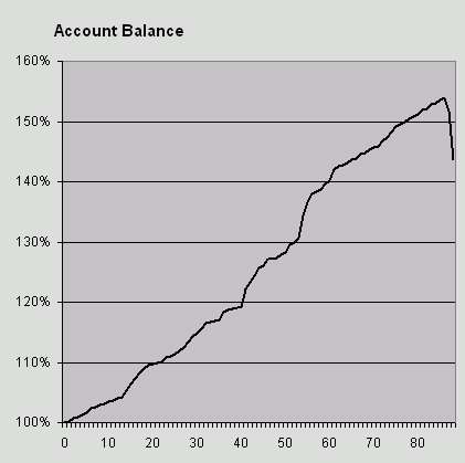 Der maximale zwischenzeitliche Drawdown der Equity (also nicht der eher nichtssagenden Account Balance) lag übrigens nur bei 15 % und bei deutlich mehr, hätte ich das Spielerchen auch eingestellt.