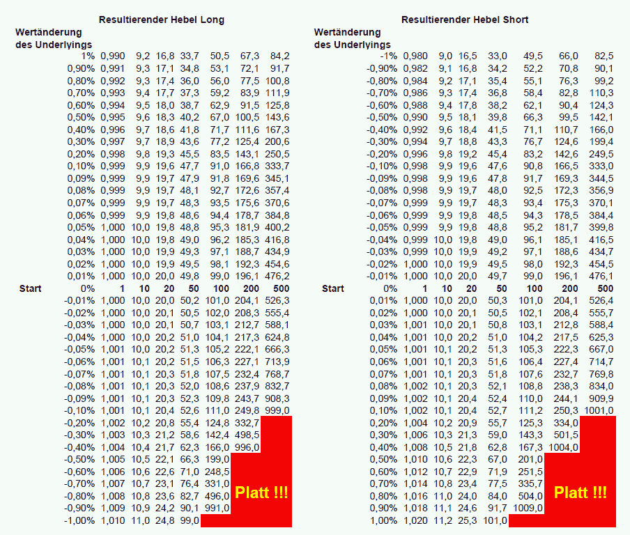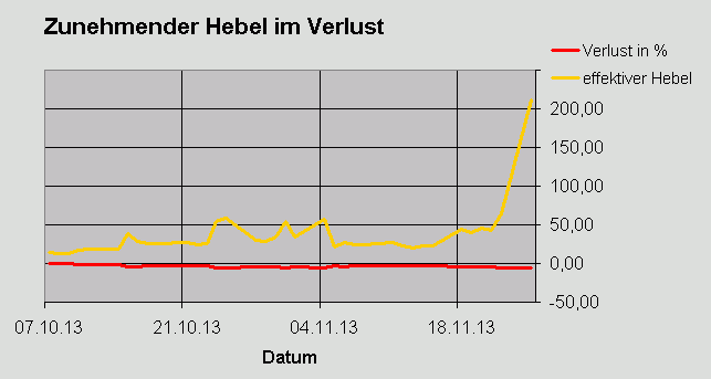 Aus den Anhängen (Tabelle und Bilder) ist ersichtlich, wie extrem schnell der Hebel bei einer Verlustposition vollkommen abstruse Werte erreicht, bei einer Gewinnposition ohne fortlaufendes Reinvestieren aber geringer wird.