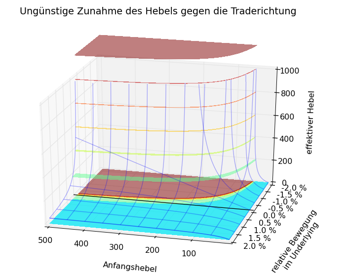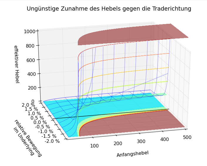 Die gefärbe Fläche stellt den effektiven Hebel dar, der dort, wo die Fläche fast senkrecht nach oben schießt, vollkommen abenteuerliche Werte annimmt.