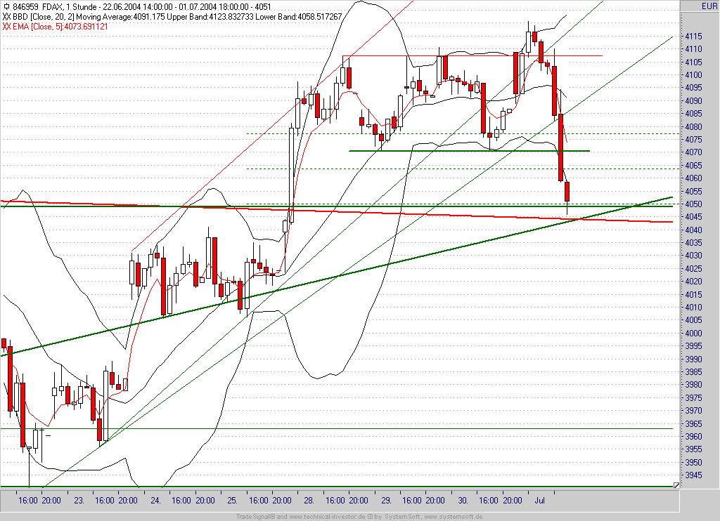 Wie angekündigt wollte ich bei einem weiteren Abwärtsschub short gehen,der war jetzt da,hatte an sich mit einer Erholung so in den Bereich 4040 gerechnet.Das sind so Momente,entweder man macht es sofort oder man zaudert den ganzen Trade lang und guckt zu.Ich glaube das jetzt die Korrektur des Aufwärtstrendes erst richtig begonnen hat,Minimalkorrektur liegt etwa bei 3450