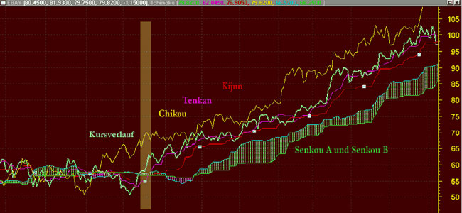 Im Chart ist Ebay dargestellt. Als Ebay den langfristigen Seitwärttrends im September 2003 (farblich gekennzeichnet) nach oben verließ wurde die "Wolke" nach oben hin verlassen. Die TenkanLinie kreuzte bereits Tage vorher die KijunLinie und Chikou befand sich über dem Kursverlauf.