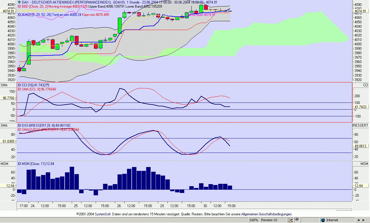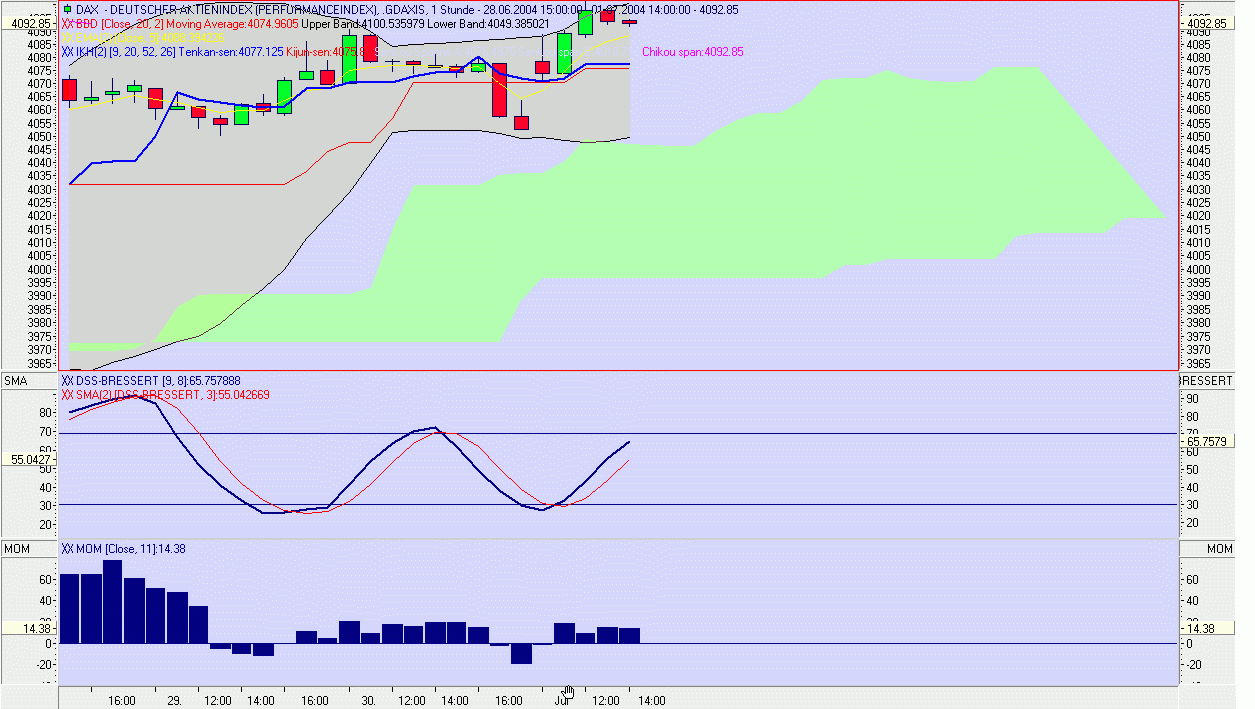 Der Ausstieg steht an! Wir befinden uns in einer Seitwärtsphase. Beim kommenden Anstieg der DSS wird der Ausstieg gesucht. Die grüne Wolke zeigt sehr anschaulich die Unterstützungsbegrenzung. Eigentlich könnte man auch den CCI/SMA herausnehmen, aber es dient mir als Mitaussage. Muss eben jeder für sich selber wissen, ob es Sinn macht.