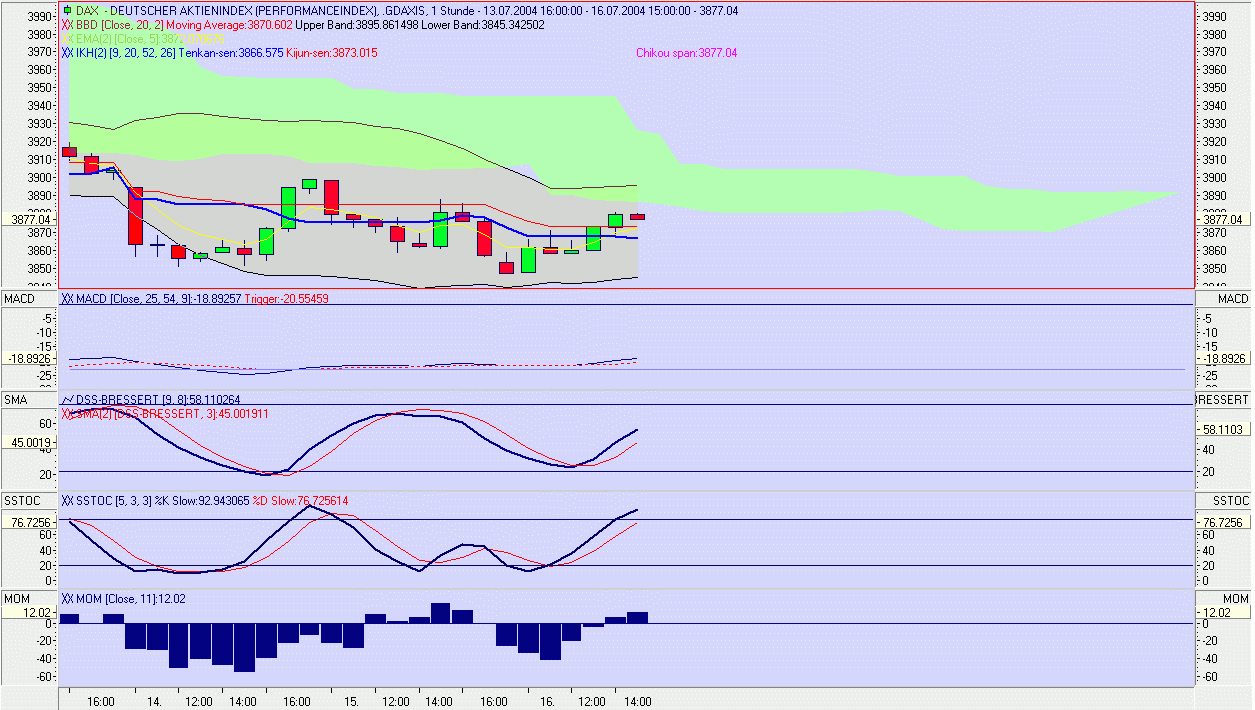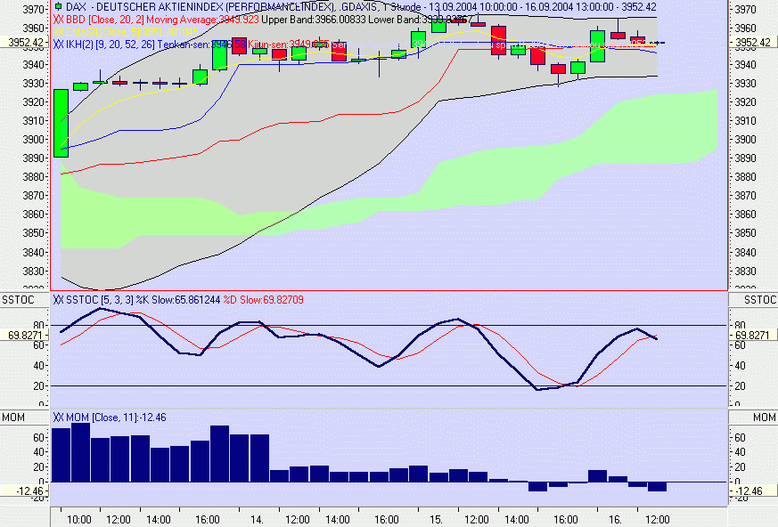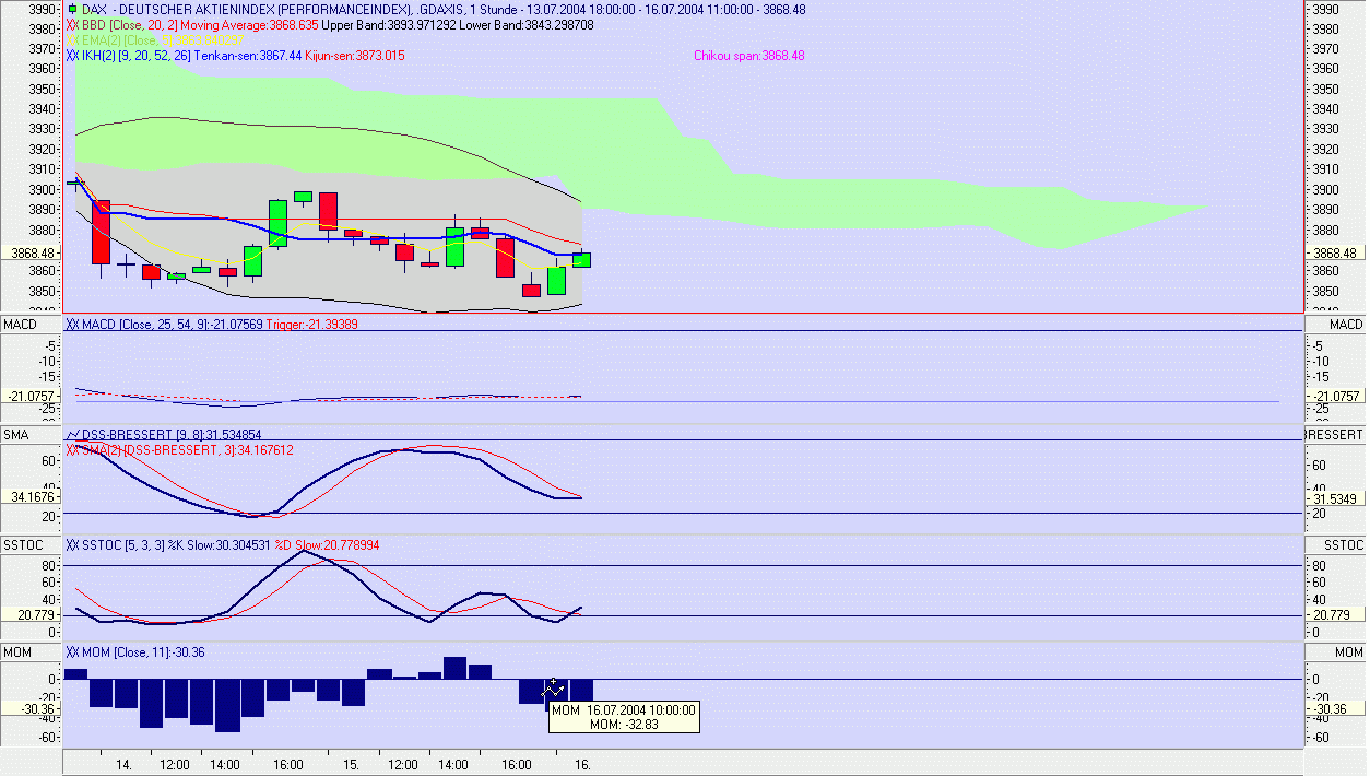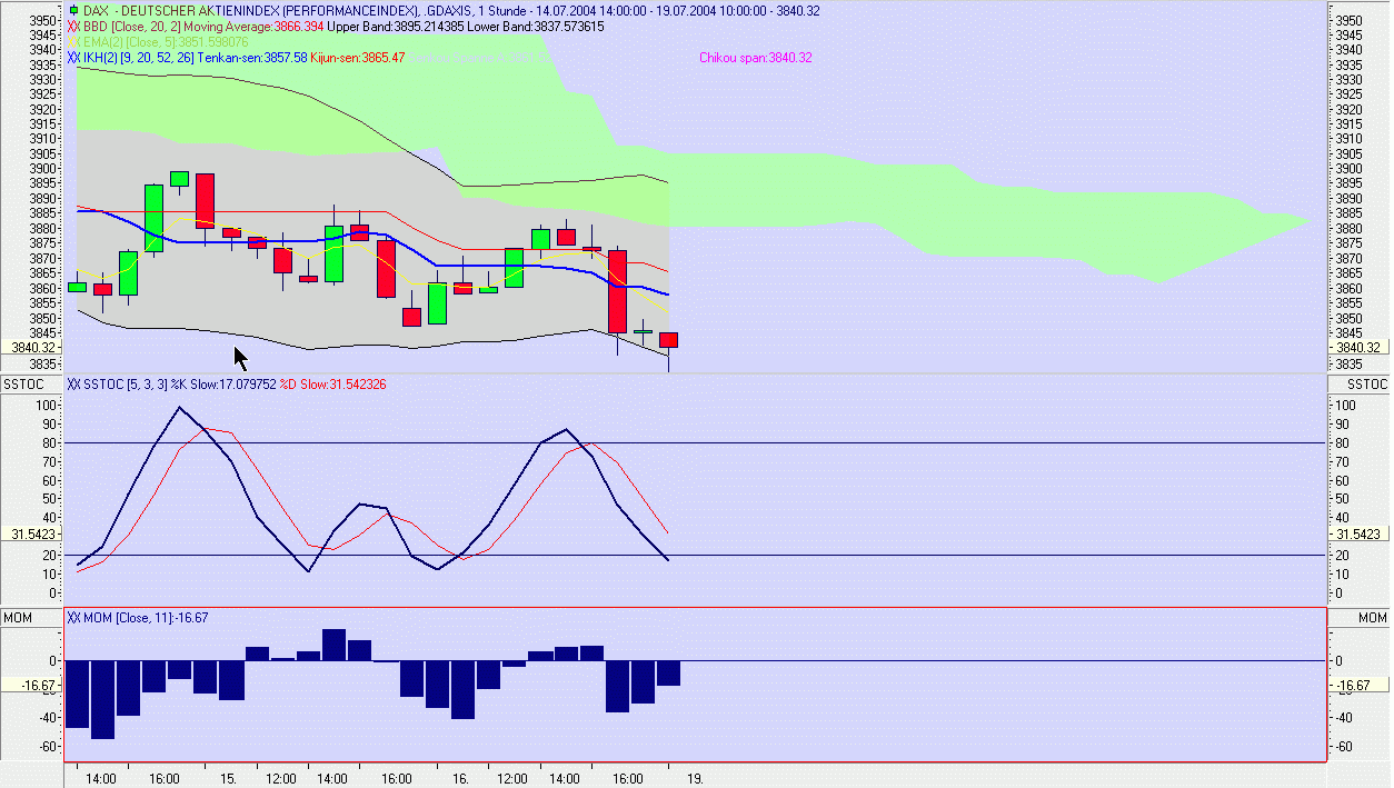 Die Tenkan-Sen hat die Kijun-Sen mit der 11 Uhr Kerze negativ gebrochen. Dazu kommt, daß inzwischen auch die Stochastik und das Momentum noch immer negativ sind. Der Tages/Wochentrend ist negativ, deshalb wurde ein Short-Trade bei 3.958 Pkt. gewagt. Sollte die Senkou-Spanne A und B d.h. die Unterstützung (grüne Wolke) nachhaltig nach unten gebrochen werden, besteht verstärktes Abwärtspotential. -