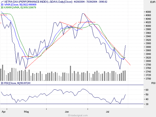 heute morgen erneut ein eröffnungsgap und der vielleicht endgültige austritt aus dem trendkanal. wir haben jetzt wieder einen aufwärtstrend (siehe chart). aber die kurse fangen schon wieder an zu schwächeln. siehe auch divergenz im rsi (das letzte hoch wird nicht bestätigt.) um den gewinn nicht wieder zu versemmeln, lege ich ein sl auf 3863, 3 punkte unter dem tief der mittagskerzen.