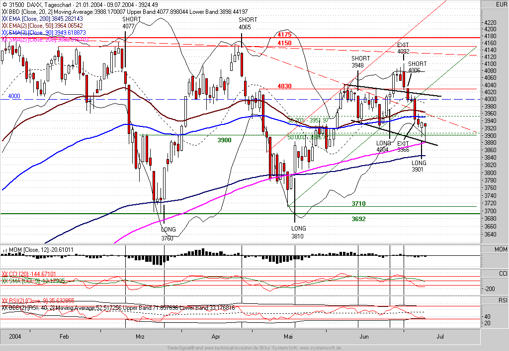 Grundsätzlich hat der DAX nun zwischen 3900/3880 eine gute Chance einen kurzfristigen Boden zu finden und sich zu sabilisieren. Grundlage hierfür ist der im Tageschart benannte Unterstützungsbereich auf diesem Niveau und die Kaufüberhänge der letzten beiden Tage (Hammer-Candle).