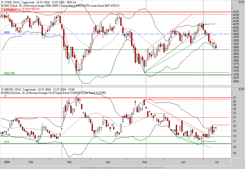 Nach wie vor zeigen sich auf der Horizontalunterstützung 3900/3880 bullische Divergenzen zu Gunsten des DAX. Das heutige Tagesschlusskurstief im DAX wurde durch den VDAX nicht bestätigt. Dieser verblieb unter seinem Tageshoch von vorgestern. Auch die horizontal verlaufenden BB des VDAX unterstützen derzeit keinen nachhaltigen Ausbruch nach oben. Folgt man diesem Signal, sollte sich in Kürze eine Erholung im DAX einstellen. Der VDAX könnte unter diesem Aspekt bis zu seiner Horizontalunterstützung bei 17,88 nachgeben. Im Gegenzug sollte der DAX zumindest bis 3980/4000 ansteigen können.