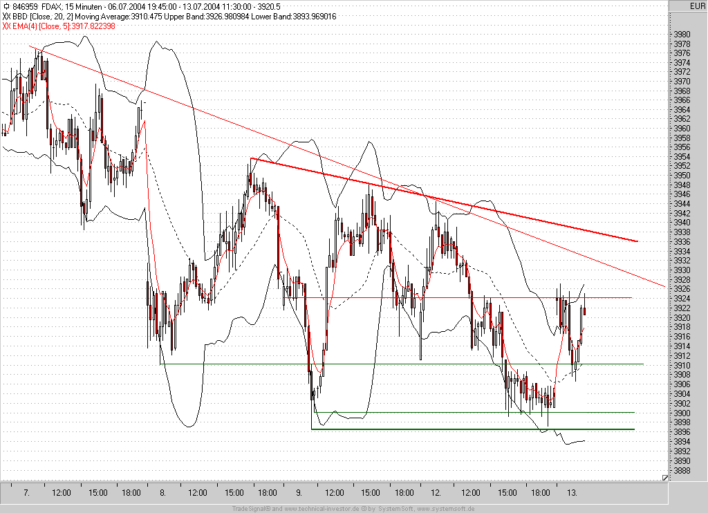 Der untere Schenkel des symmetrischen Dreiecks wurde im Handelsverlauf nochmals nach unten erweitert. Im 15min-Bereich befindet sich der 1. Widerstand derzeit bei 3915.