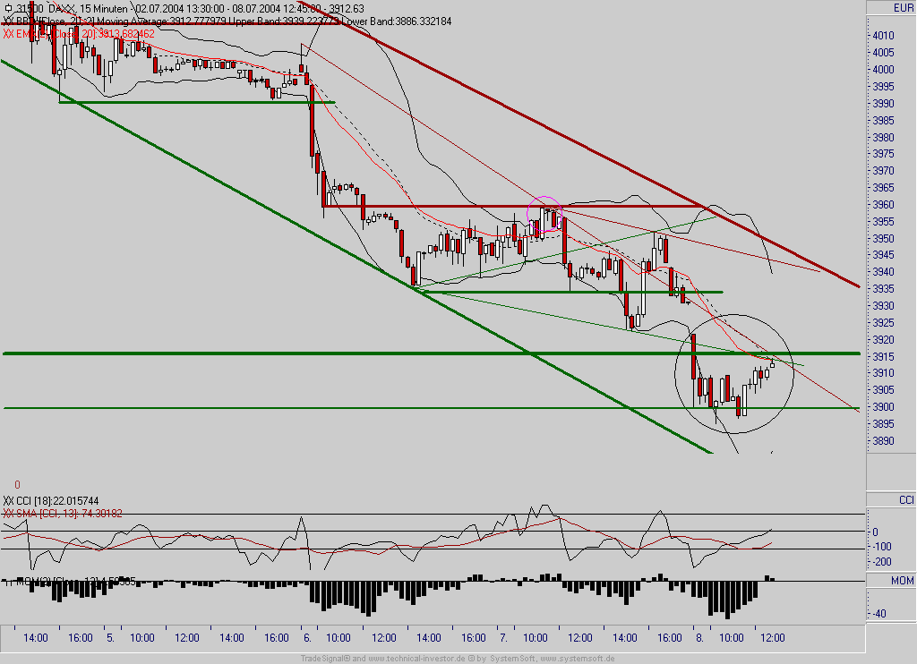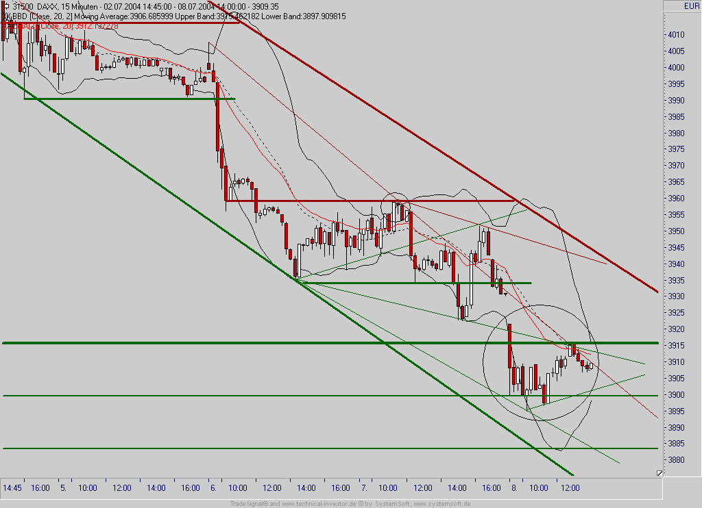 Der DAX bildet im 15min-Bereich derzeit ein symmetrisches Dreieck aus und bewegt sich in den BB in einen Enpass hinein. Der DAX sollte nun die Gelegenheit beim "Schopfe" packen und baldmöglichst einen Ausbruch über 3915 vollziehen können, damit nicht weiter nachgebende Kurse auf der Tagesordnung stehen. Ein nochmaliger Test der 3900 ist jederzeit möglich, welcher sich dann jedoch innerhalb des skizzierten Dreiecks vollziehen sollte, um ein positives Bild zu wahren. Aber wer von uns Nasen kennt schon die Arbeitsmarktdaten von heute im Vorfeld? Deshalb können um 14:30 meine Ausführung bereits Makulatur sein.