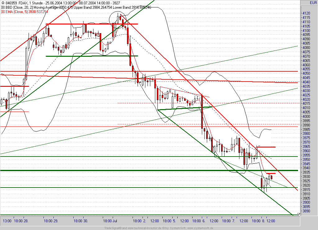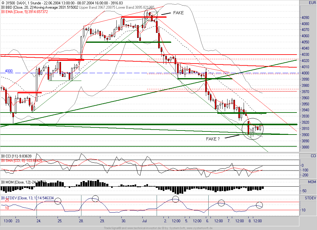 Der DAX konnte zunächst zumindest seinen 1. Intraday-Widerstand bei 3915 auf Stundenschluss zurückerobern und steht derzeit an einer inneren Abwärtstrendlinie an. Diese sollte jedoch im weiteren Verlauf mit einer nicht so schlecht wie erwarteten US-Handelseröffnung und einer sich legenden Angst zu knacken sein.