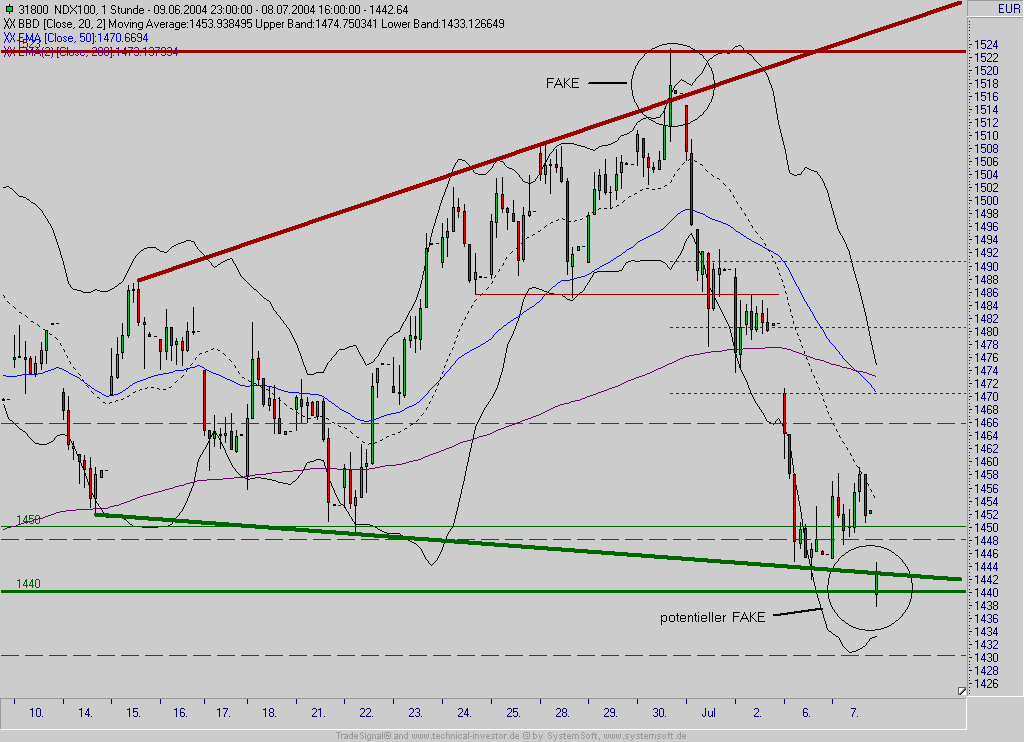 Für alle die sich noch nicht für einen DAX-Long entscheiden können, kann im NDX ein signifikanter Stundenschluss innerhalb des inversen Dreiecks abgewartet werden. Dies gibt höchstwahrscheinlich den weitern DAX-Verlauf vor. Diesbezüglich verweise ich auf meine gestrigen 23:00-Meldungen, speziell was Fehlausbrüche betrifft.