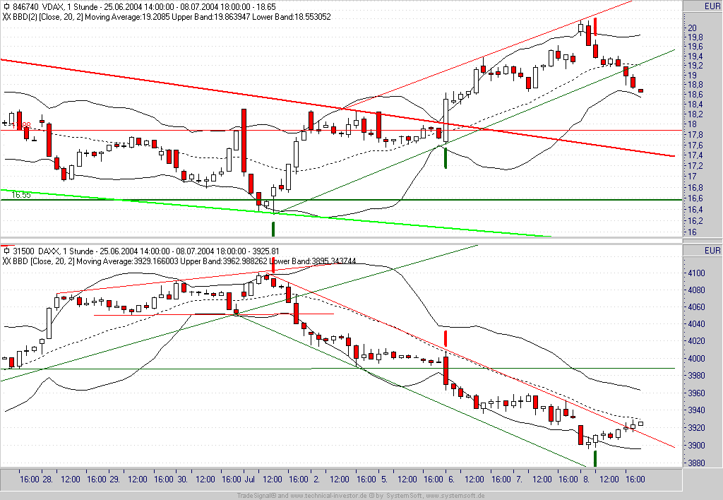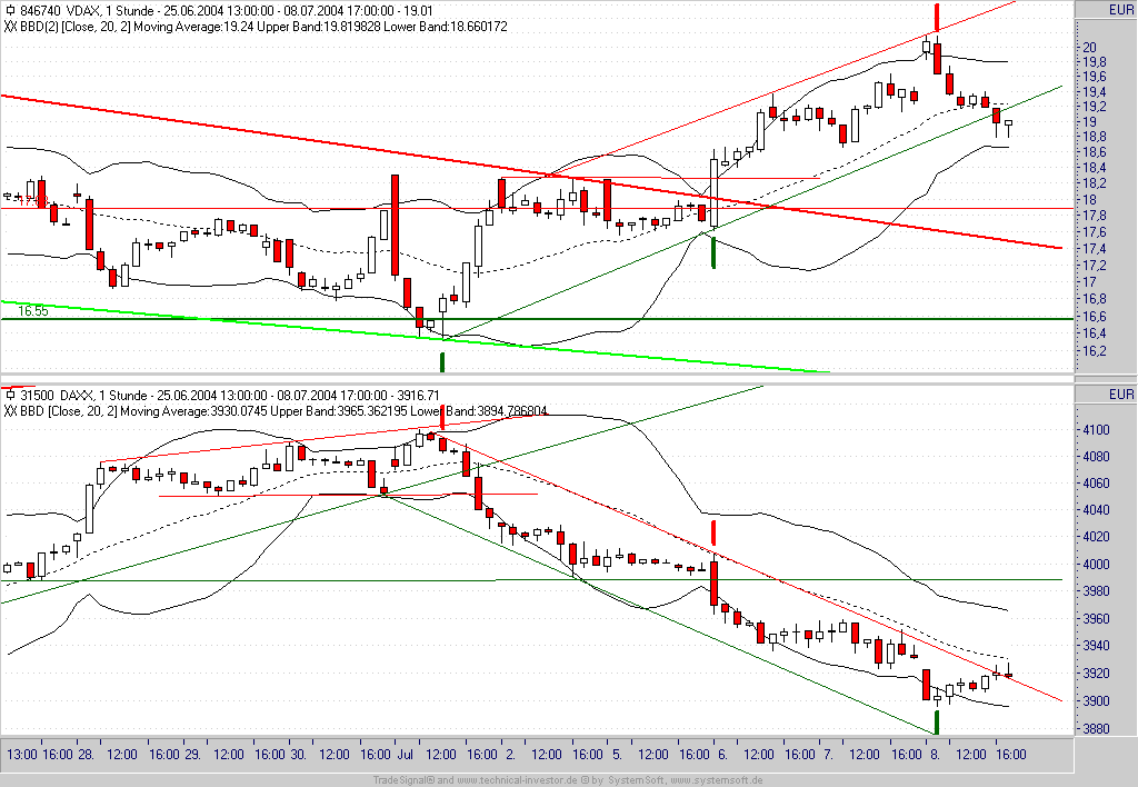 Bisher konnte man sich auf den VDAX als zuverlässigen Signalgeber immer verlassen, wie die markierten Signale zeigen. Der Aufwärtstrend ist nun definitiv nach unten verlassen. Ein Umkehrsignal stellte sich bereits um 12:00!!! ein. Leider habe ich mich von den US-Erstanträgen zum kurzfristigen Verkauf hinreißen lassen. Aber es hätte ja auch tatsächlich schlimmer kommen können. Zudem ist es nicht einfach, in dem Moment, wenn alle Short sind und Weltuntergangsstimmung verbreiten, genau das Gegenteil zu tun um seine Strategie strikt zu verfolgen.