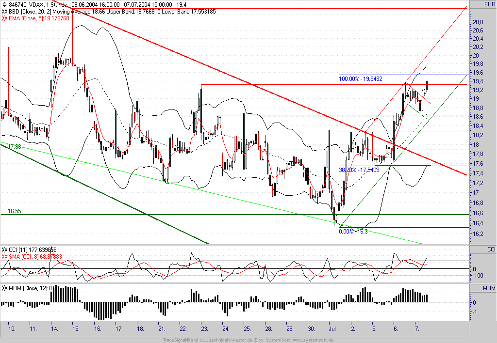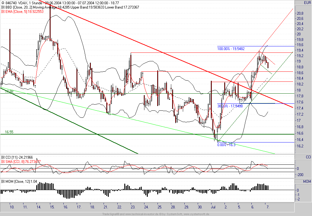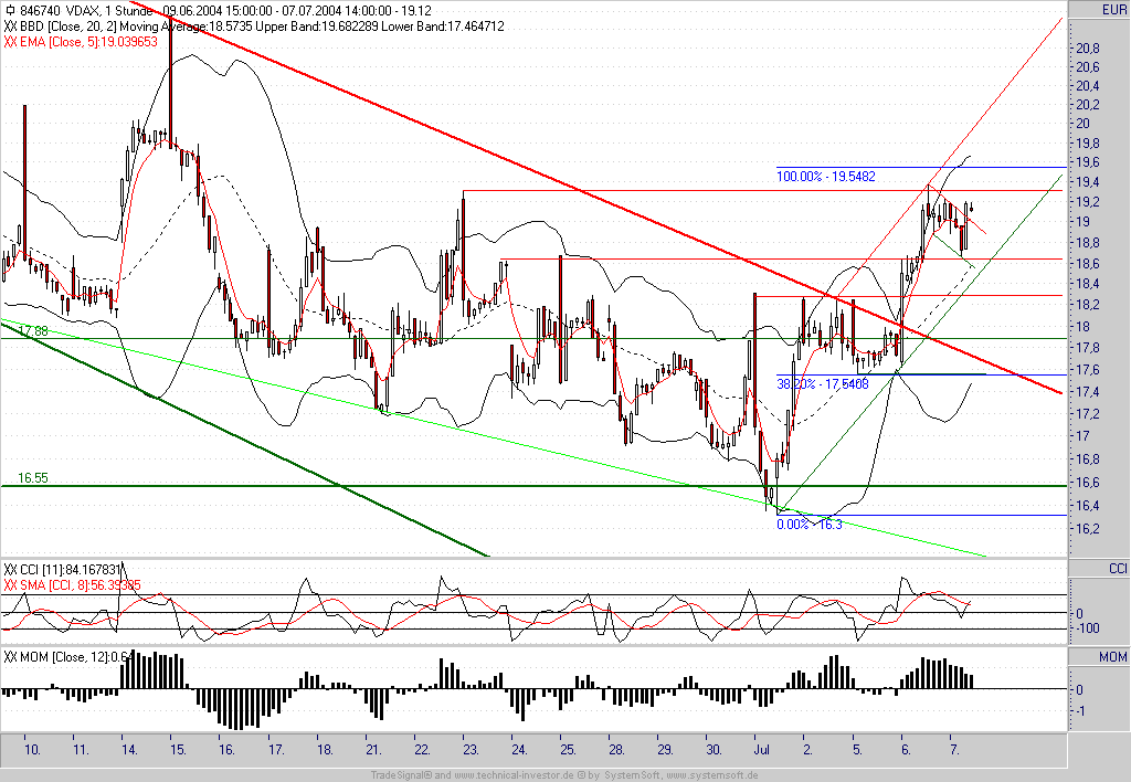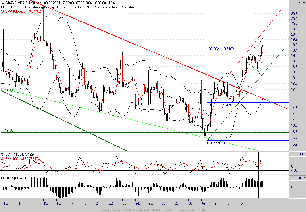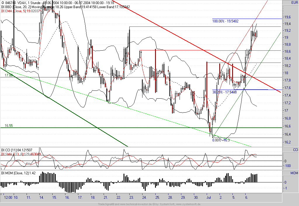 Wie befürchtet handelte es sich im VDAX um ein bullisches Konsolidierungsmuster - aus dem er nun nach oben ausgebrochen ist. Es ist somit mit einem weiteren Anstieg bis zunächst 19,55 zu rechnen (100%-Ausdehnung). Sollte die laufende Stundenkerze auf dem aktuellen Niveau schließen können würde auch der CCI wieder ein Kaufsignal generieren.