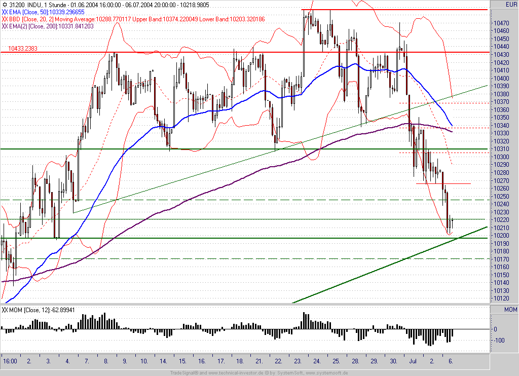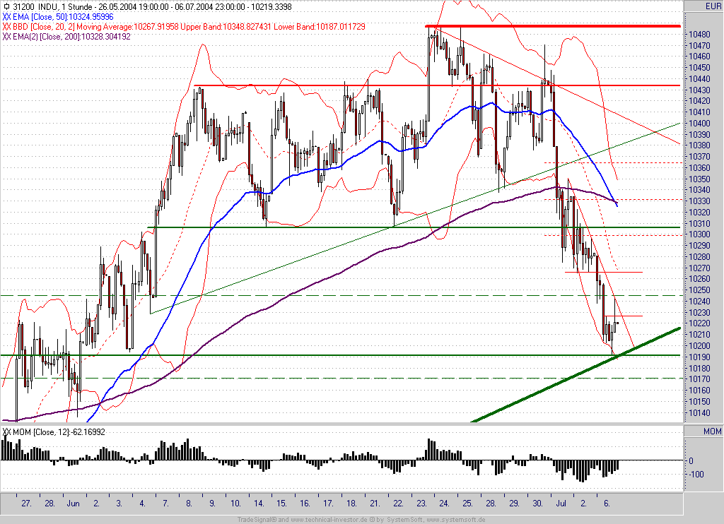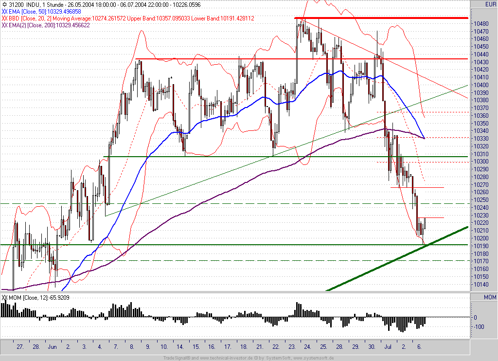 Du hast vollkommen Recht. Ich sehe mir derzeit ausschließlich den DJ an. Der steht nämlich an einer wichtigen Kreuzunterstützung (10200/10180) bestehend aus Aufwärtstrend seit 12.06.04 und einem horizontalen Unterstützungsbereich. Derzeit steigendes MOM. Ich finde hier liegt der Schlüssel für den weiteren Verlauf, wobei ich Indraday-Fakes nicht beachten würde, da das rein rechnerische Kursziel des Ausbruchs aus der vorhergehenden Seitwärtsbewegung ziemlich genau bei 10190 (+/- 10 Punkte) liegt.