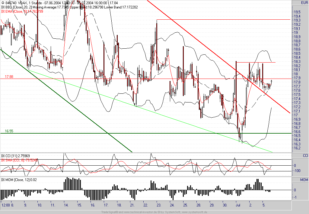 Im 60min-Bereich des VDAX ist nunmehr nach bullischen Umkehrsignalen Ausschau zu halten. Weitere signifikante Abgaben im DAX (unter 3990) sollten durch dieses Signal und einen anschließenden Anstieg des VDAX über sein Widerstandsniveau (18,27) eingeleitet werden.Dieser Beitrag wurde bereits 3 mal editiert, zuletzt von „Exlibris“ ()