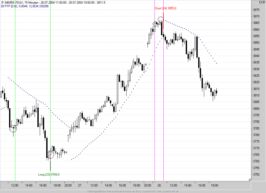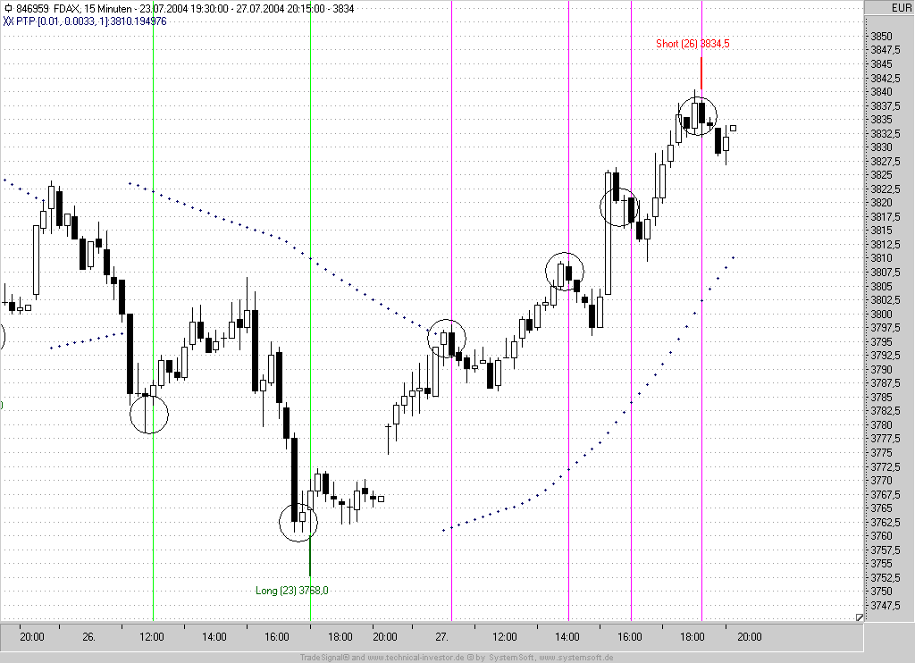 Mit etwas Glück um 16:00 (wie bereits gestern schon um kurz vor 20:00) ist das Short-Signal von heute 11:30 immer nocht aktiv. Die aktuelle PTP-Einstellung wurde somit wieder bestätigt. Auf diese Weise konnte das Signal-System in den letzten beiden Handelstagen mit einem einzigen Indikator als Signalgeber zwei ordentliche Bewegungen im 15min-FDAX "einfangen". Natürlich lebt dieses Trend-Reversal-System von stärkeren Bewegungen, da möglichst frühzeitig ein Trendwechsel zum Einstieg genutzt wird. Der PTP-TS liegt aktuell bei 3836.