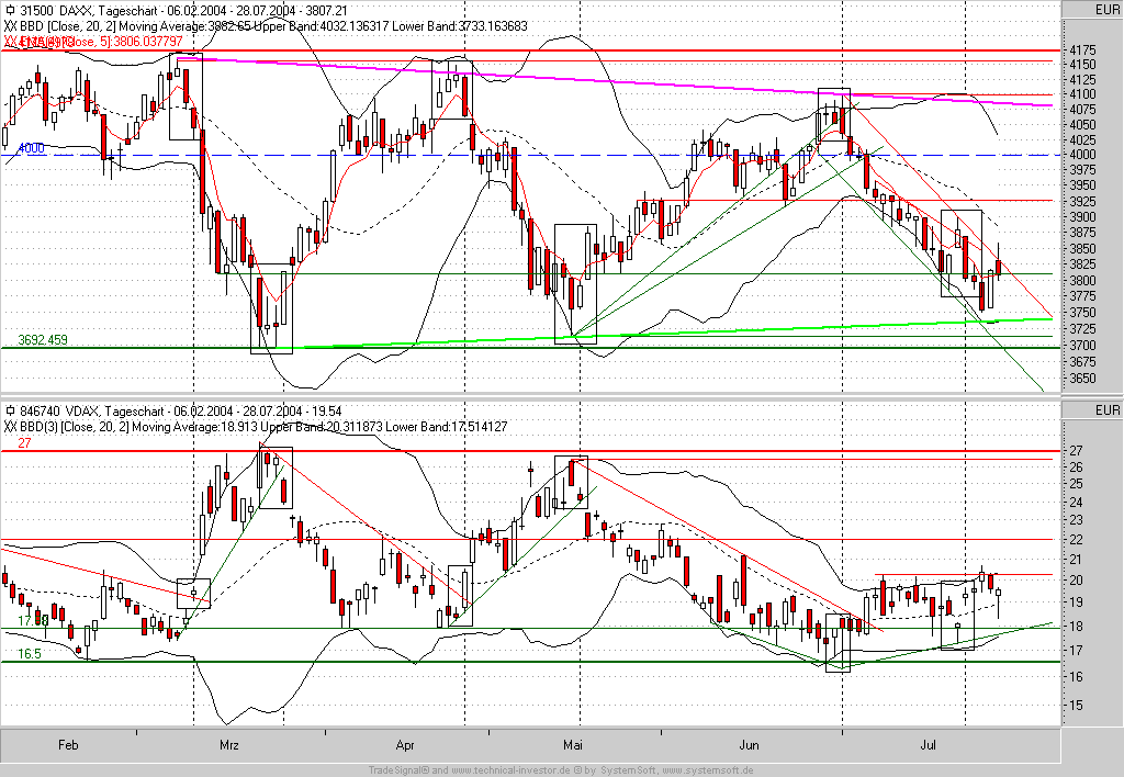 Wenn man zu diesem Zeitpunkt vor dem Moni gesessen hätte - die Charts sahen bearish aus - wäre die "Versuchung" groß gewesen, Long zu liqudieren. Es kam allerdings anders und die Schlußauktion brachte den Dax um ca. 10-12 Punkte nach oben - die Futures reagierten sofort - und das bearishe Chartbild war dahin.