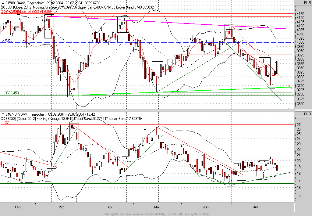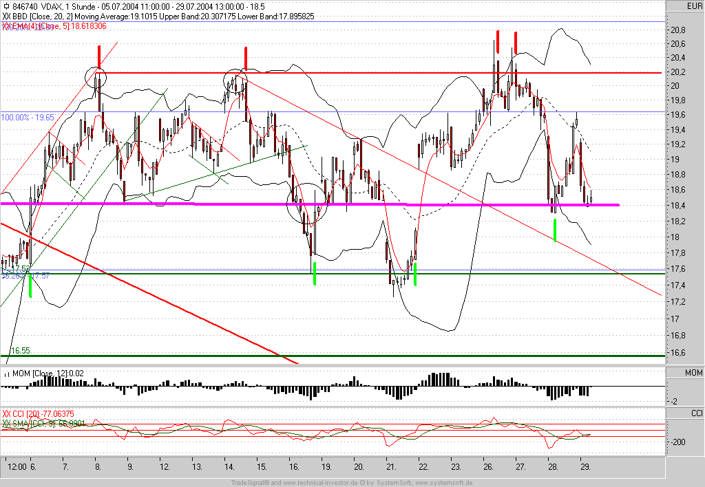 Auch der VDAX kann sich derzeit nicht entscheiden und korrigierte heute seinen "Fehl"-Ausbruch von gestern und steht damit wieder auf Neutral. Aus Intermarketgesichtspunkten sollte er jedoch eher wieder seinen Unterstützungsbereich bei 17,88 aufsuchen, was wietere Zugewinne im DAX versprechen könnte.