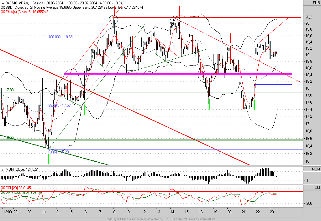 Das Up-Gap im 60min-VDAX hat nach wie vor Bestand. Solange dieser nicht unter die Gap-Oberkante zurückfällt sind Long-Positionen kein Thema und daher Short-Positionen mit engen SL klar der Vorzug einzuräumen. Nach oben hat der VDAX noch kurzfristig Potential bis 19,65 und 20,20. Werde deshalb den SL wie folgt nachziehen.