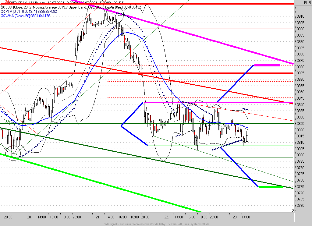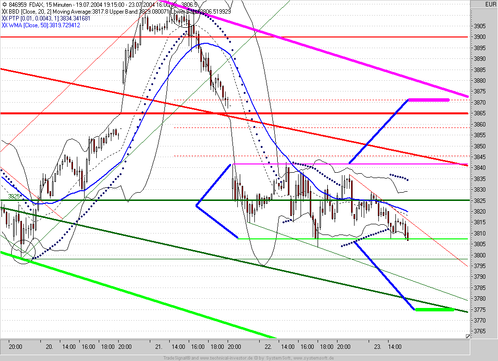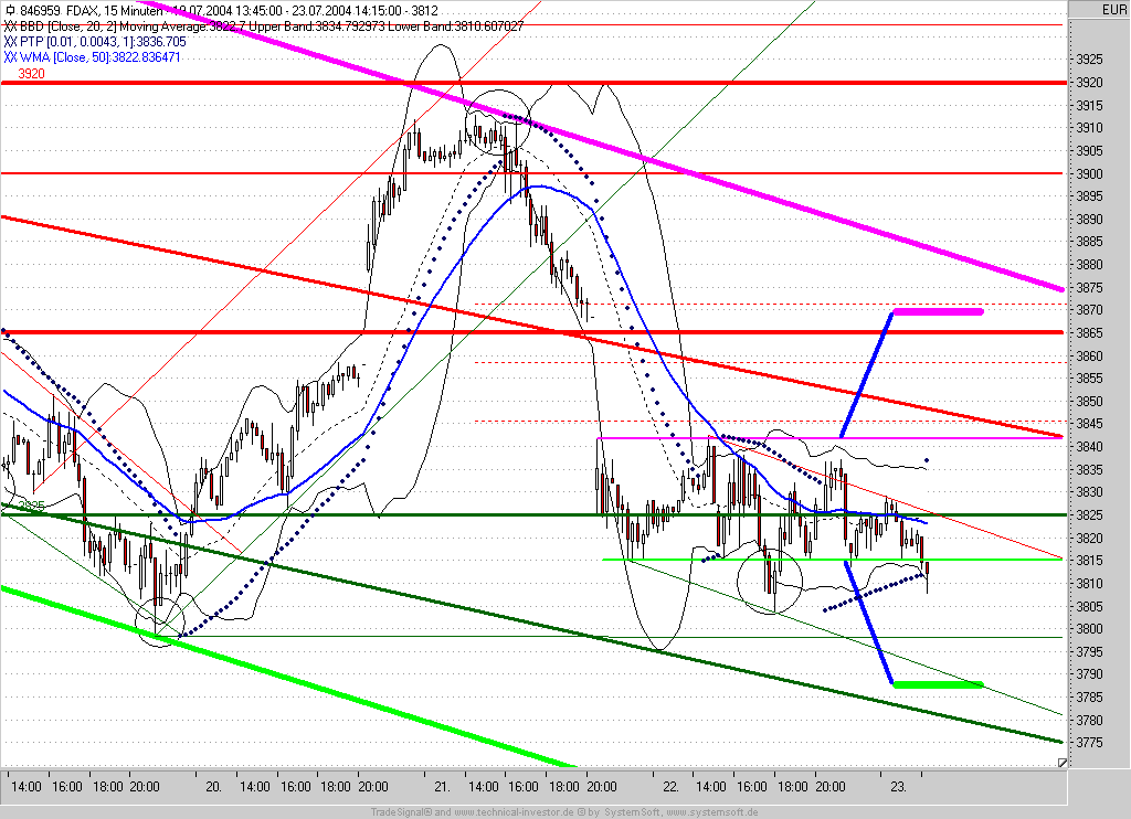 Das Zwischentief bei 3785 zeigt sich heute noch zu sehr als starke Unterstützung. Dies kann sich vielleicht bis 17:30 (Wochenende) noch ändern, allerdings habe ich nicht vor die Position overnight zu halten. Auch die US-Indizes stehen wieder nahe an ihren Zwischentiefs - insofern sehe ich es als gerechtfertigt an. Auffällig ist die bullische Einkeilung des FDAX. Hier können zwar noch Abgaben an den unteren Schenkel erfolgen, aber sollte der FDAX im weiteren Verlauf seinen kurzfristigen Abwärtstrend überwinden können stehen wir nämlich wieder ganz schnell bei 3840 (DAX 3825). Die Zahl "39" schein mir jedenfalls Glück zu bringen.