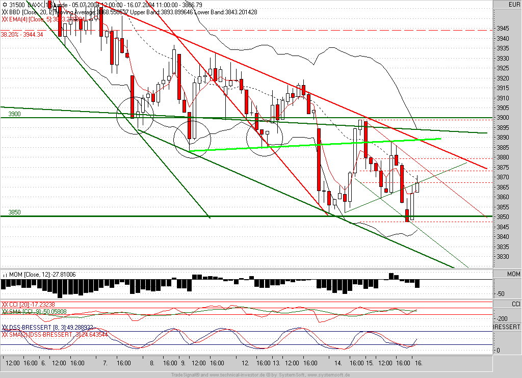 DAX und FDAX kämpfen bereits an ihrem 38%-Retracement mit ihren Widerständen und der 15min-FDAX formiert schon wieder eine untergeordnete bärische Wedge aus wie man unschwer erkennen kann. Klar zu sehen ist jedoch auch eine bullischen Einkeilung. Innerhalb dieses Bullkeils sind nach unten jedoch jederzeit Kurse um 3855 (DAX ca. 3840) möglich.