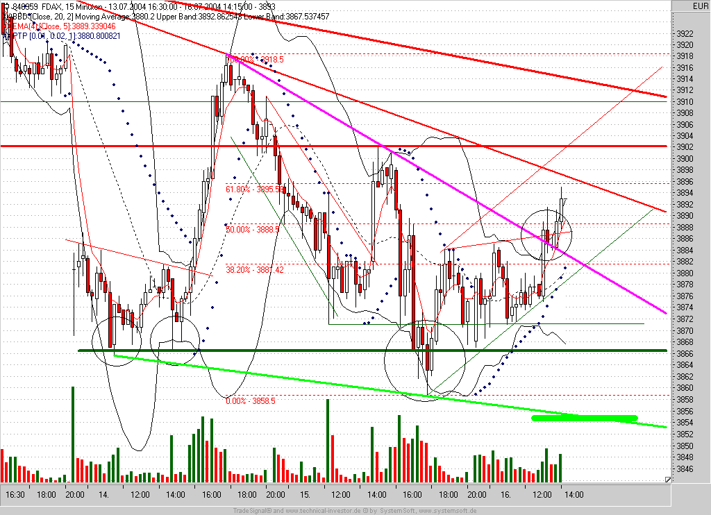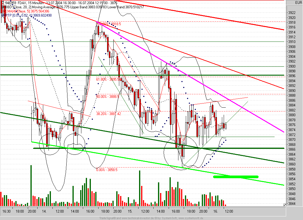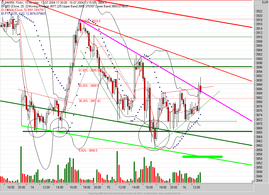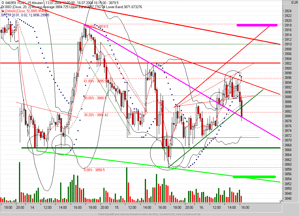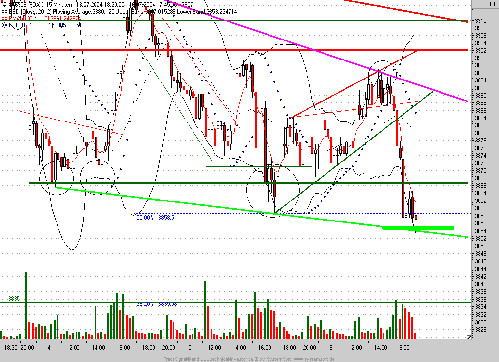 Bei 3825 wird kurzfristig der Verkauf der Short-Position angestrebt. TS nunmehr auf Einstieg -2P nachgezogen (3860)