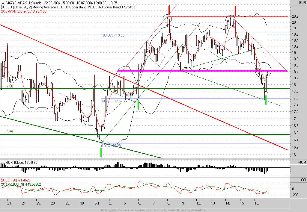 So sieht es derzeit im 60min-VDAX aus. Dieser hat zumindest schon mal temporär ein Verkaufssignal generiert, steht aber schlon fast auf seiner Unterstützung bei 17,88 und der CCI im unteren Extrembereich. Das kann nicht guthehen. Ich frage mich nur, wann es sich im DAX endlich durchsetzen wird. Der DAX hat zwar bereits im Vorfeld der US-Eröffnung bereits anziehen können und somit schon einiges an "Vorschusslorbeeren einheimsen" können. Der Ausbruch über markante Kursniveaus gelang bisher jedoch noch nicht.