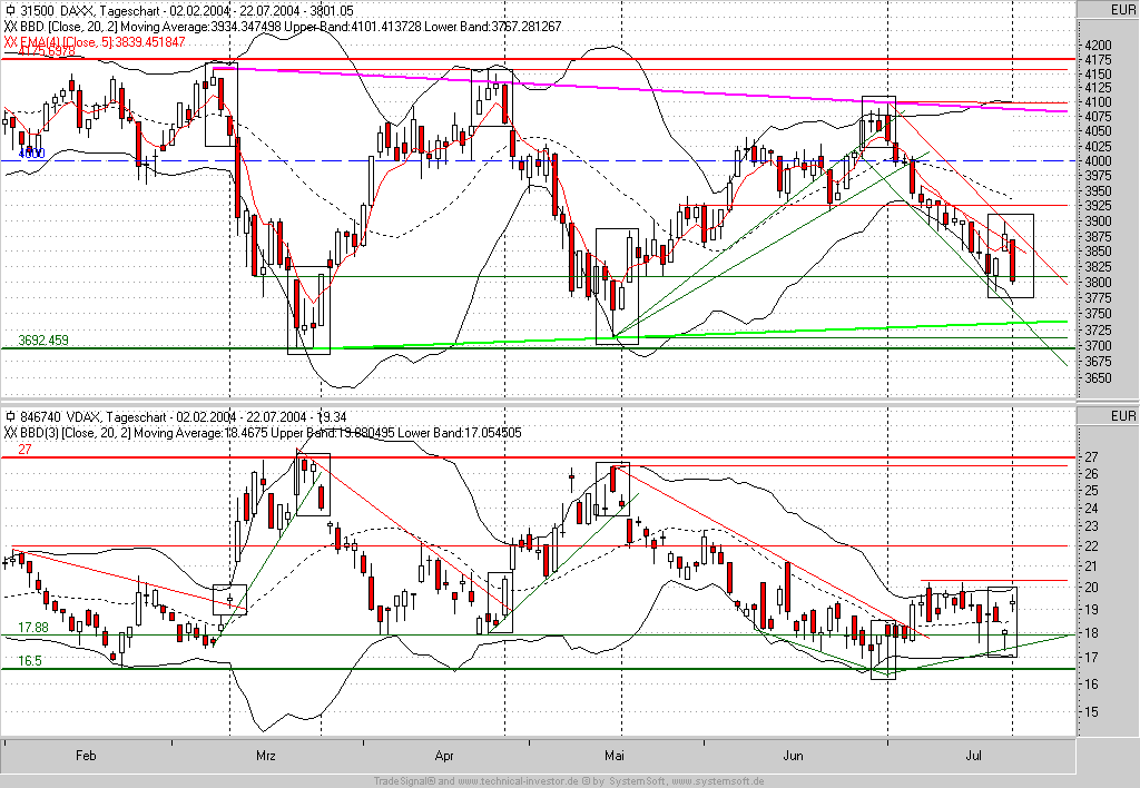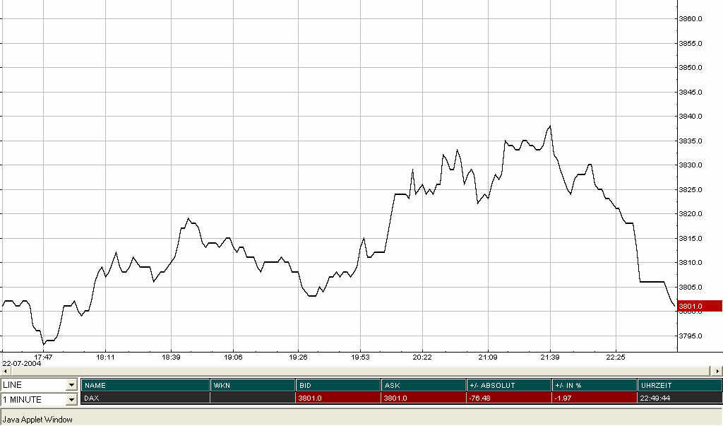 Dies hat bei mir gestern spät abends wieder einwandfrei funktioniert. Es hat den Vorteil, dass man die im Verlust geschlossene Position dann auch schnell vergessen hat. Somit auch ein psychologischer Vorteil. Die Short-Position heute habe ich geschlossen, da der DAX einfach nicht unter 3800 abtauchen wollte. Erst kurz vor Handelsschluss, wenn es i.d.R. zu Übertreibungen wegen des Orderstaus kommt, ging es mal ein paar Punkte drunter.Dieser Beitrag wurde bereits 2 mal editiert, zuletzt von „Exlibris“ ()
