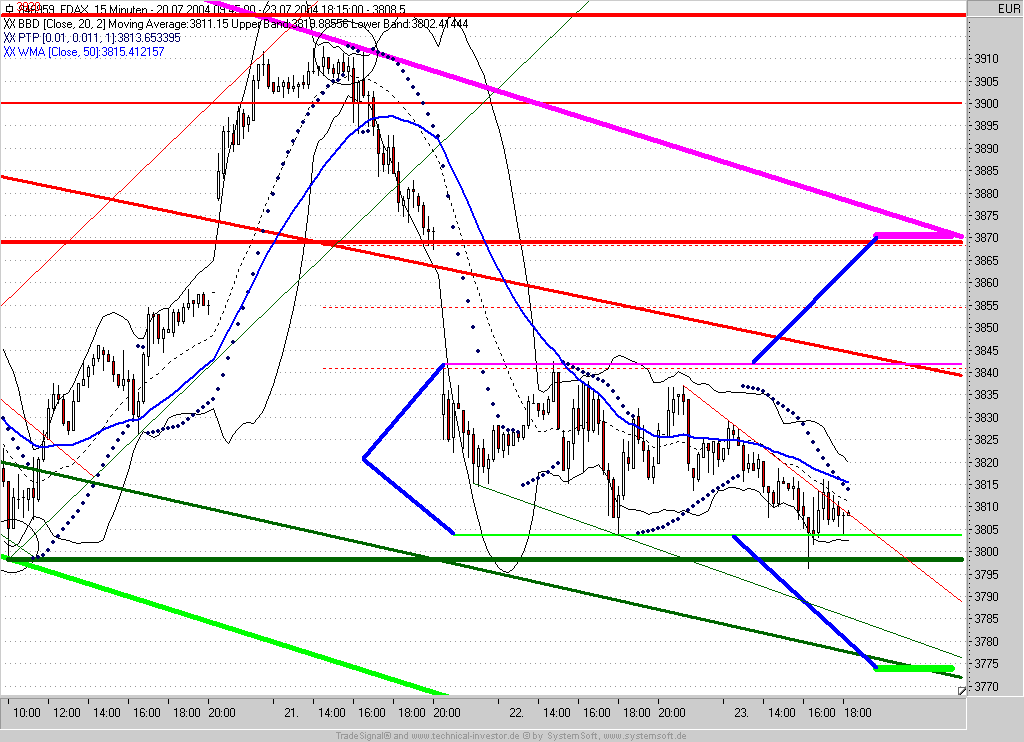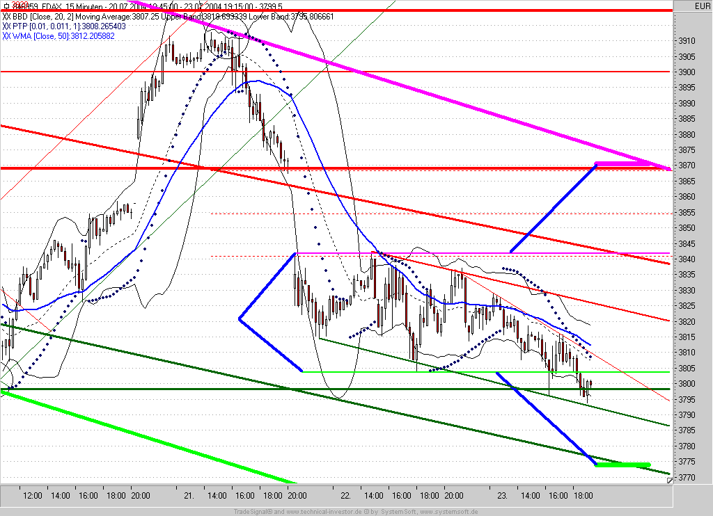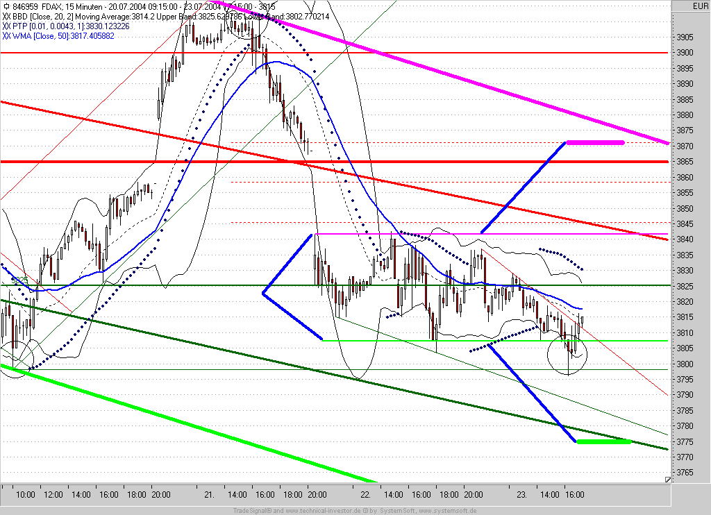 Kauf einer spekulativen Long-Position ! Grund ist das bullische Piercing-Pattern von 17:00 und der erneute positive Test des Zwischentiefs bei 3785.