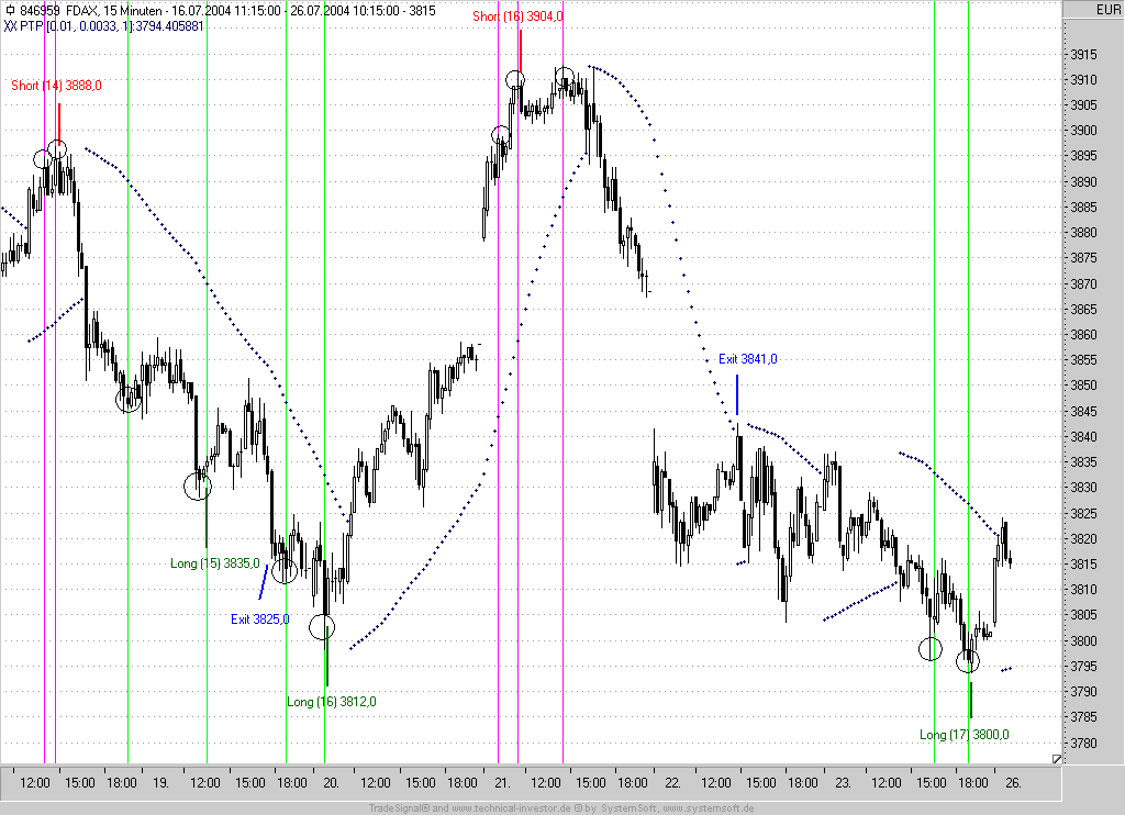 Der PTP selbst generiert in diesem System keine Kaufsignale. Er dient lediglich als TS in Trendphasen. Zudem wird ein Handelssignal durch den PTP negiert, sollte in dessen "näheren" Umfeld dieser in das Gegensignal switchen. Nur in diesen beiden Fällen hat der PTP erste Priorität. Ansonsten bleibt er völlig unbeachtet. Seine Einstellung im 15min-Bereich ist kein Geheimnis (0,01/0,0033/1).