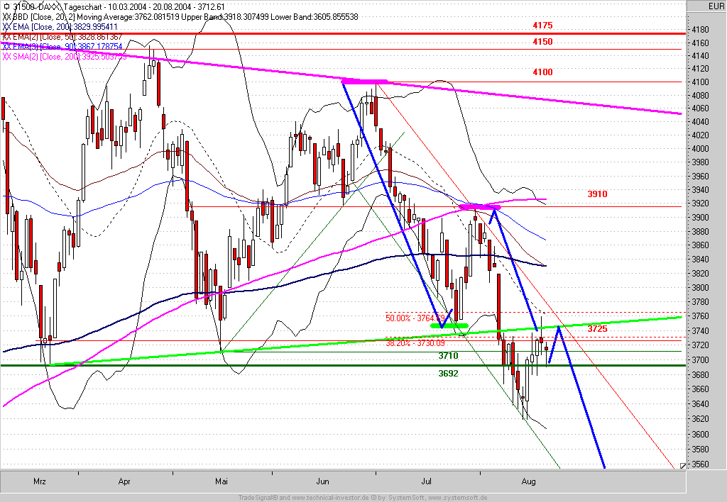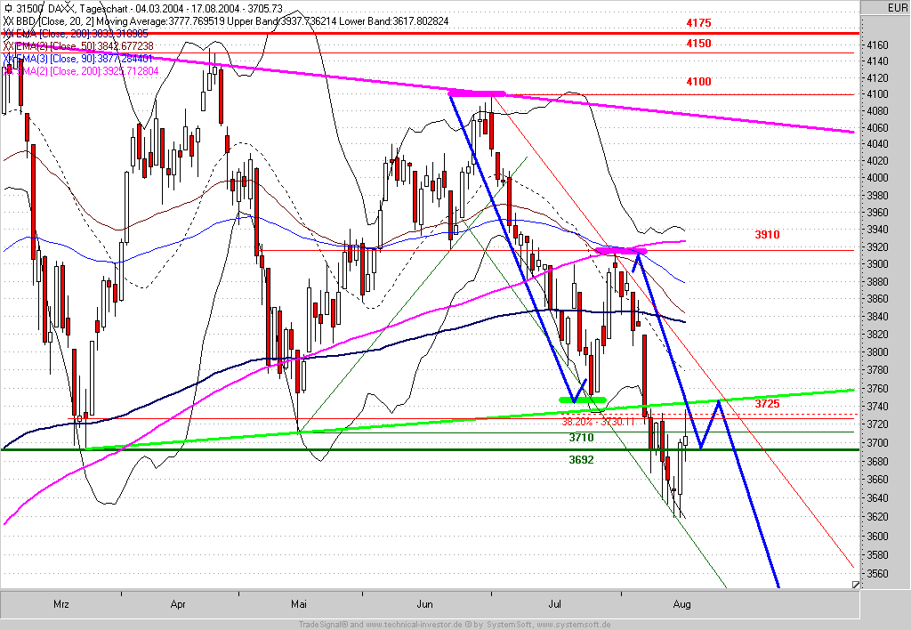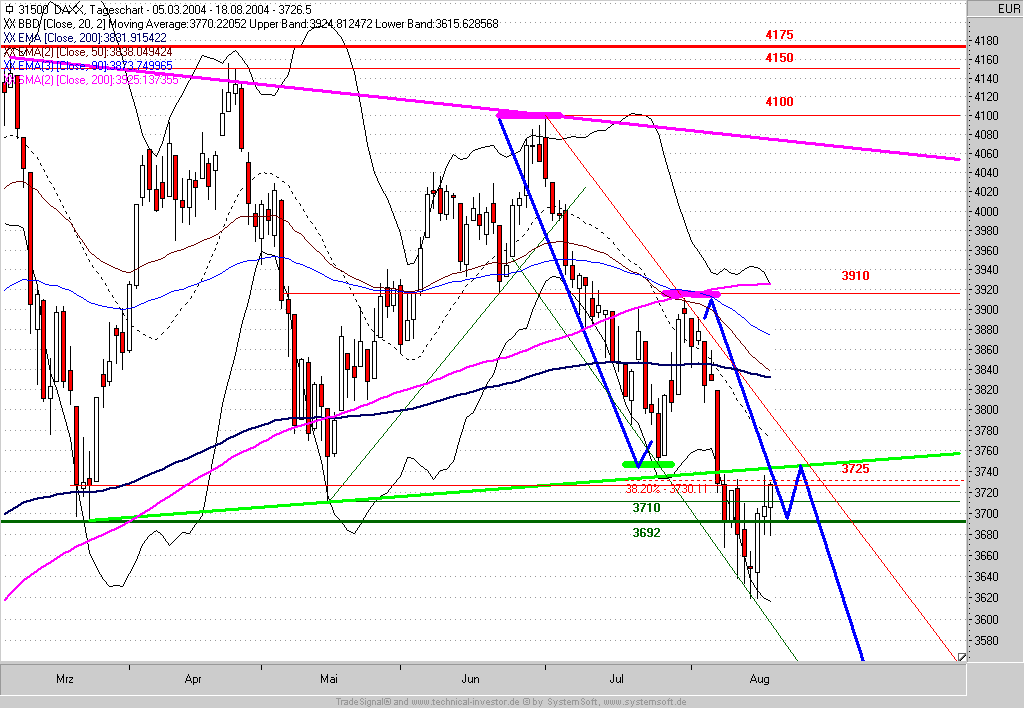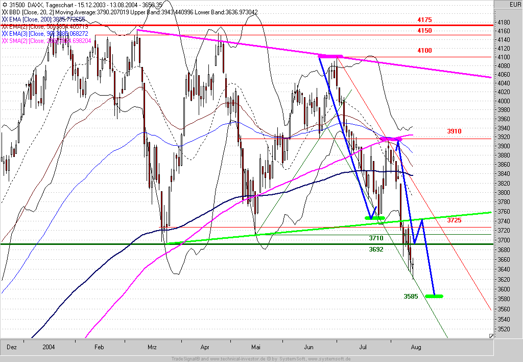 Grundsätzlich steht fest: Der DAX konnte auf Wochenschluss-Basis seinen Unterstützungsbereich bei 3700 nicht halten. Auf Sicht von 4-6 Wochen wurde daher weiteres Abwärtspotential bis ca. 3420 generiert.