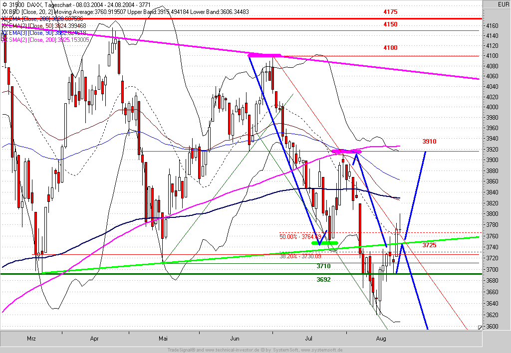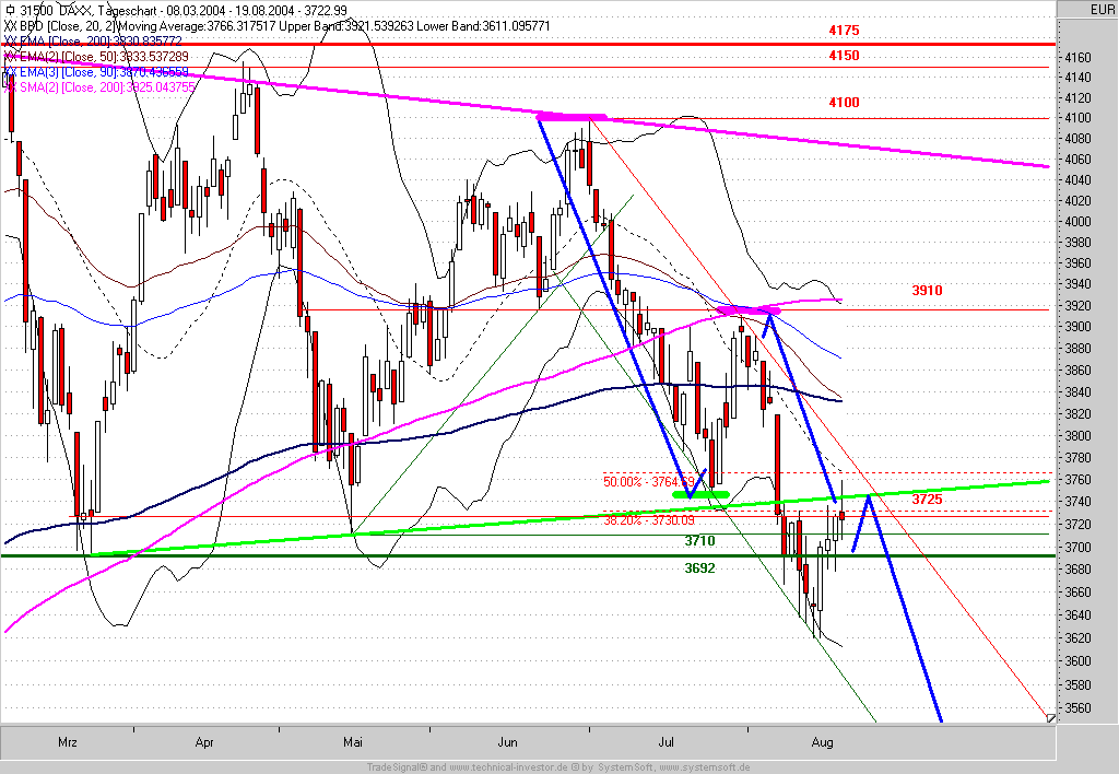 Kurzfristig besteht derzeit jedoch beschränktes Aufwärtspotential bis 3730 (38,2%-Retracement der letzten Abwärtsbewegung), max. bis ca. 3750 (unterer Schenkel der Dreiecksformation). Für den morgigen Handelstag wird daher eine Sell-Limit-Order in den Markt gelegt.