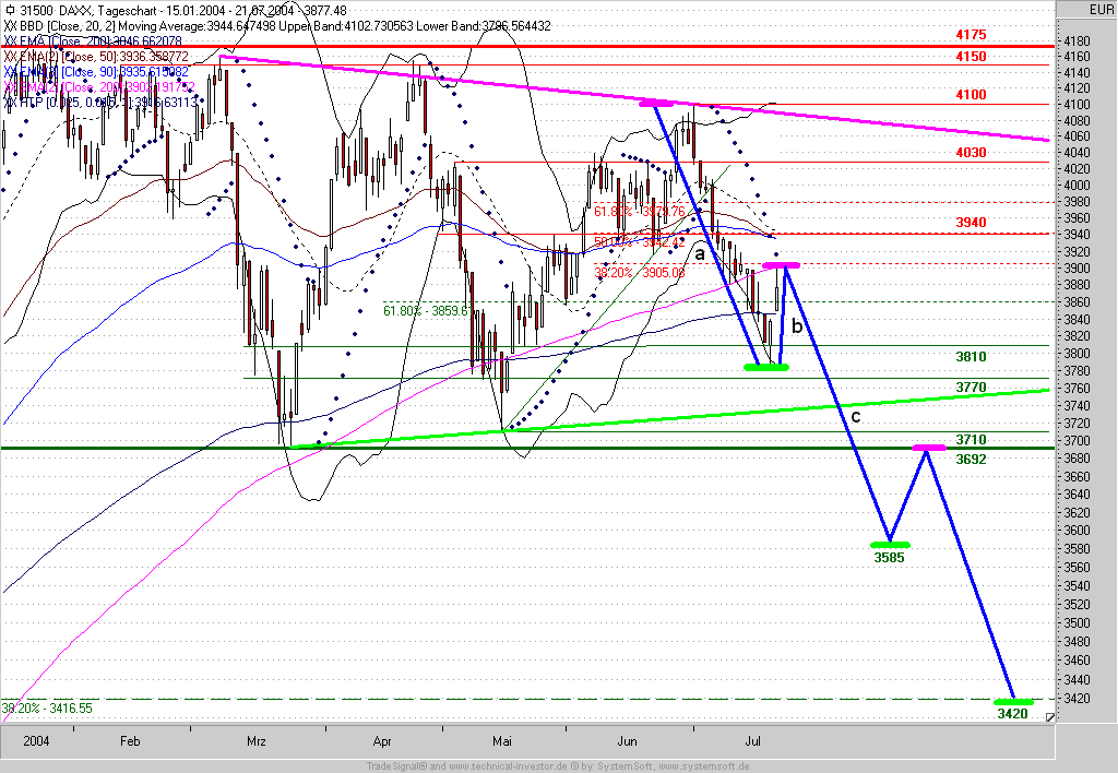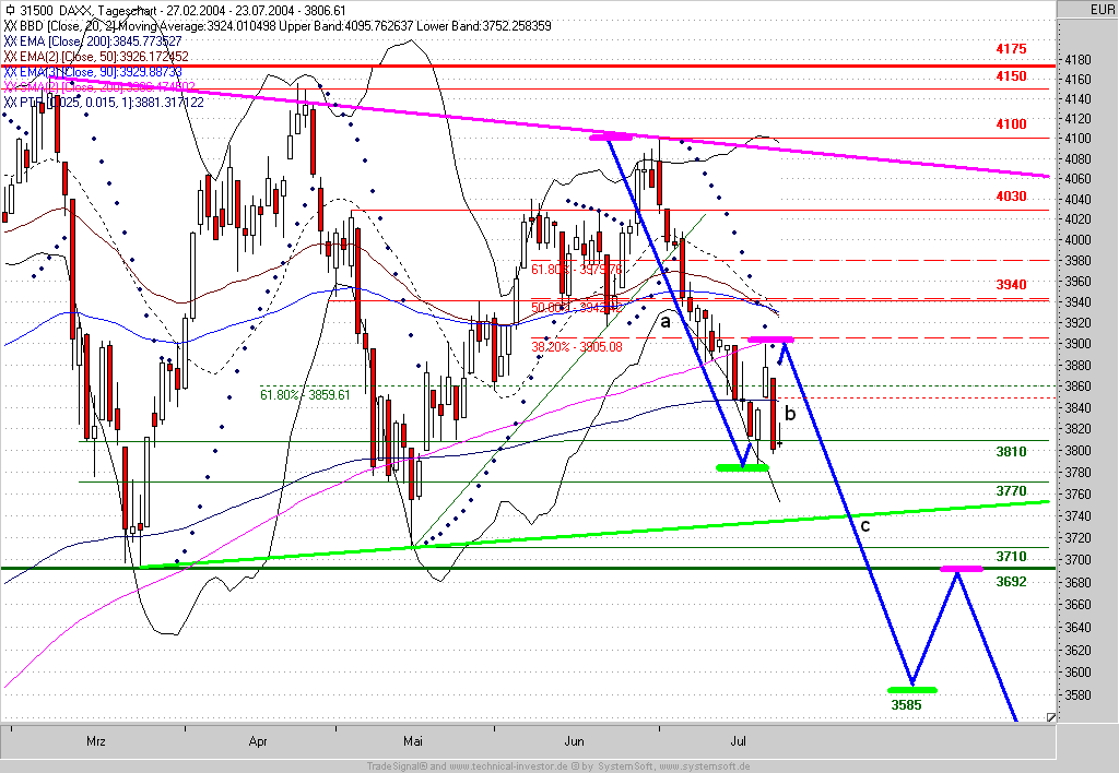 Eine "hammerharte" Formation, die sich da die letzten drei Handelstage ausgebildet hat. Diese spricht sehr dafür, dass innerhalb kürzester Zeit beide Parteien (Bullen + Bären) kräftig auf die "Mütze" bekommen haben. Solange jedoch das Zwischentief bei 3785 nicht gebrochen wird, ist noch nichts entschieden. Eine kurzfristige Seitwärtstendenz ist dann wohl naheliegend.