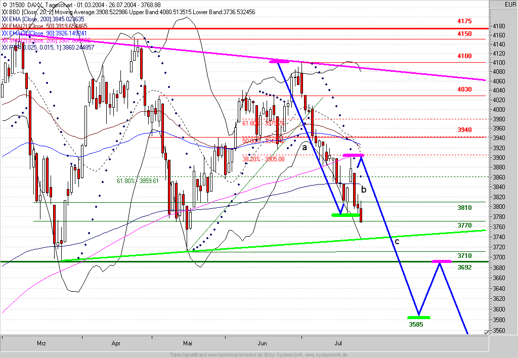 Glaubt man der aktuellen Banken-Indikation, so würde der Dax am Montag sofort seinen Support bei 3785 (Dax-Future 3793) aufgeben. Das eröffnet kurzfristiges Abwärtspotential bis ca. 3725.