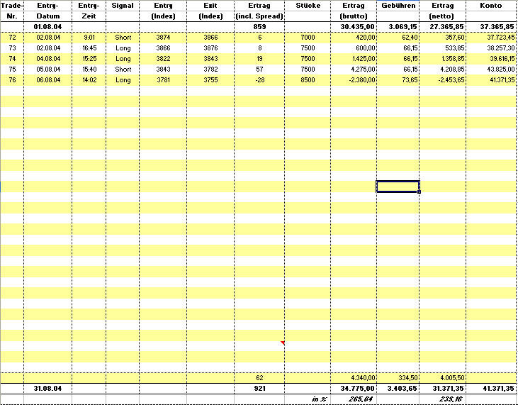 Wenn Du meine Performance-Entwicklung nach jedem geschlossenen Trade genau verfolgst, wirst Du bemerken, dass ich nicht den Porfit im Future aufsummiere sondern lediglich den Profit im DAX. Der Spread von 2P wird dann nochmals im Fact-Sheet berücksichtigt. Also die Trades und die dazugehörigen Kurse sind nicht an den Haaren herbeigezogen, wenn Du das mit Deiner Bemerkung gemeint haben solltest.