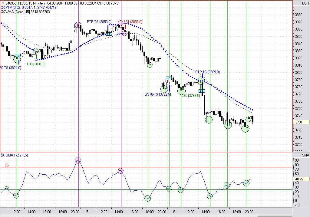 um 16:15 fiel der fdax erneut zurück, erreichte aber den unteren ptp (zu diesem zeitpunkt bei 3674,67 (lt. tradesignal) nicht!