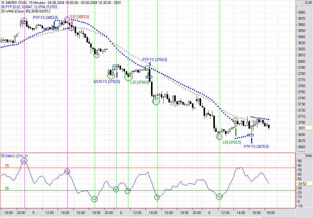 Die zwischenzeitlich eingegangene Long-Position wurde kurzfristig am PTP ausgestoppt. Aufgrund der Indikatorenlage kann derzeit nur ein Long-Signal über den PTP-Switch (3704,0) zur Ausführung kommen.