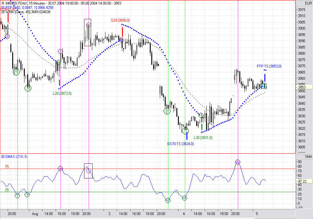Für den Fall, dass aufgrund kurzfristiger Kursspitzen im Underlying, diese durch den ZYK5-Indikator bestätigt werden, wird unter bestimmten Voraussetzungen ein Signal (Long/Short) trotzdem aktiviert. Dazu muß für ein Short-Signal der Schlusskurs der Folgeperiode einer Kursspitze unter dem Eröffungskurs dieser Kursspitze und unter dem Schlusskurs der zweiten vorangegangen Periode notieren. Insofern handelt es sich um ein Fehlsignal im Underlying, das den Signalgeber nur kurzfristig zur Fehlinterpretation des Kursverlaufs veranlaßt hat. Für ein Long-Signal gilt o.g. Regel vice versa. In diesem Fall wird die Notierung der Folgeperiode des Indikators mit dem bis dahin aufgetretenen Zwischenhoch (Long = Zwischentief) verglichen. Sollte danach eine Divergenz aufgetreten sein, wird das damit "aktivierte" Handelssignal über den PTP-Switch ausgeführt.